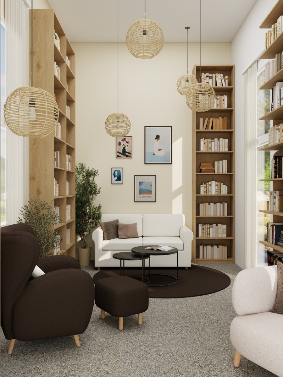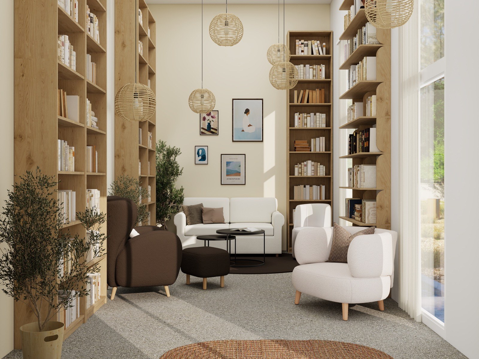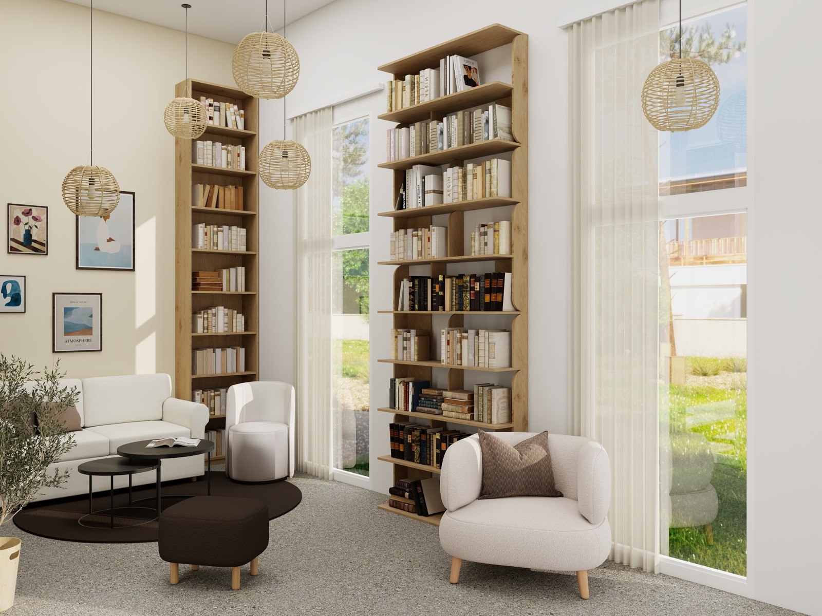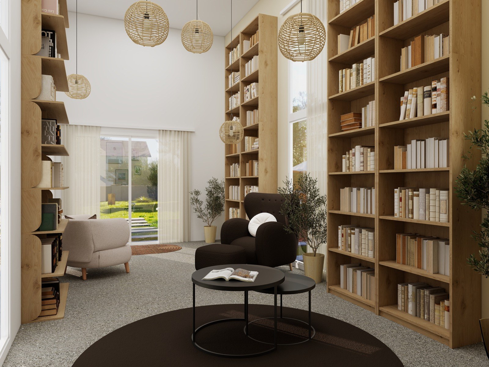 V prostoru se nahaja več knjižnih polic v lesu, ki knjižnici dajejo občutek strukture in značaja, obenem pa ponujajo veliko prostora za knjige in dekorativne elemente. Osrednji del dopolnjuje sedežna garnitura ter več udobnih naslanjačev, ki ustvarjajo različne kotičke za branje, sprostitev ali pogovor.