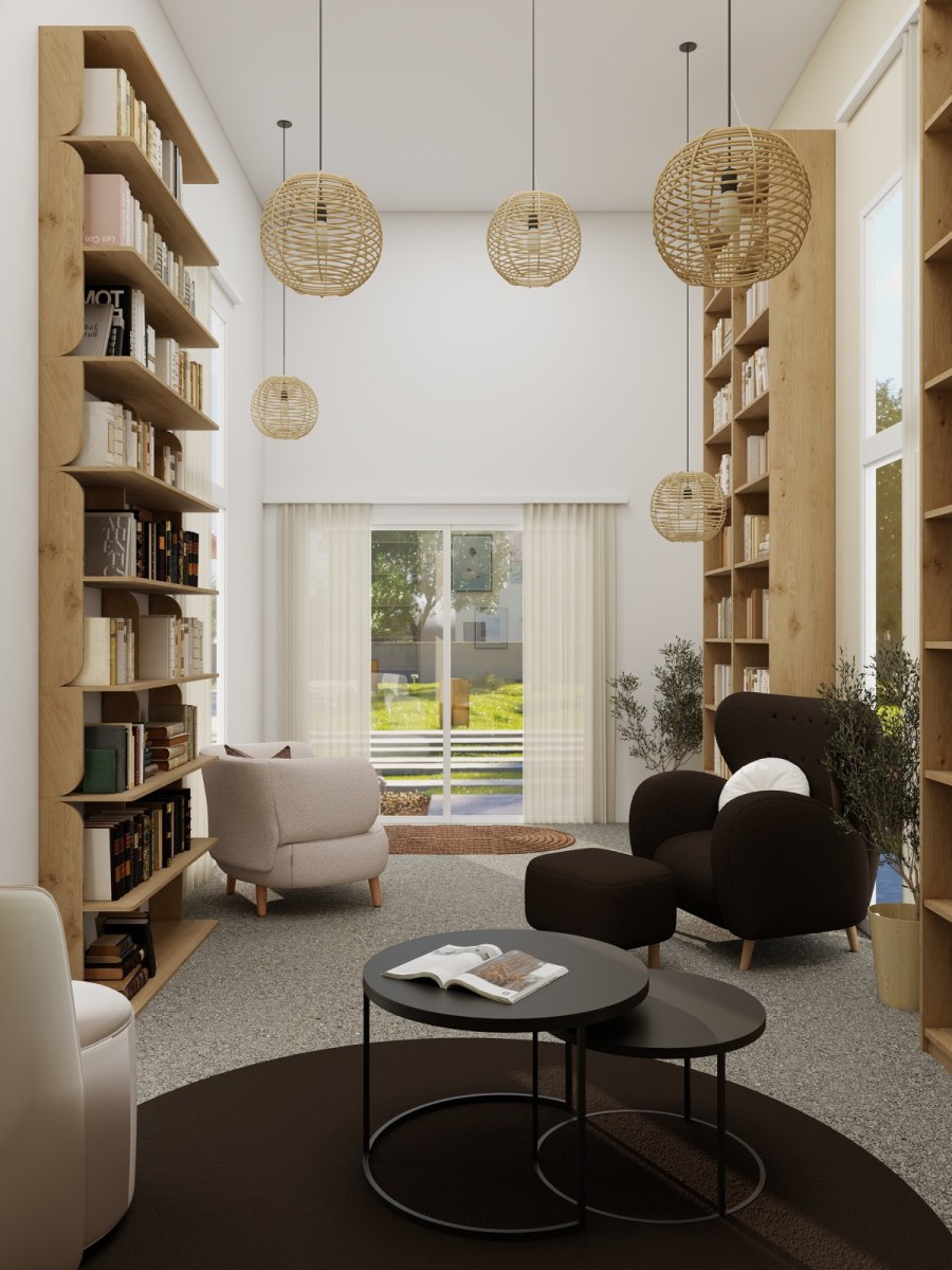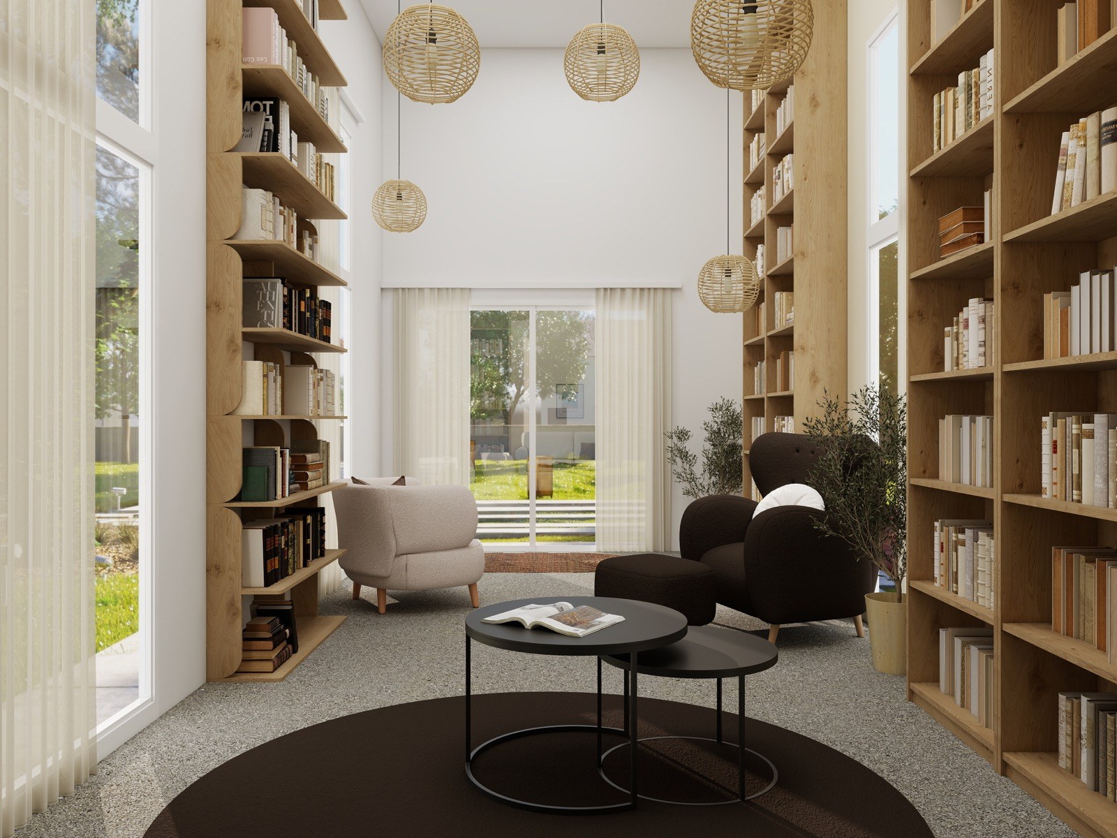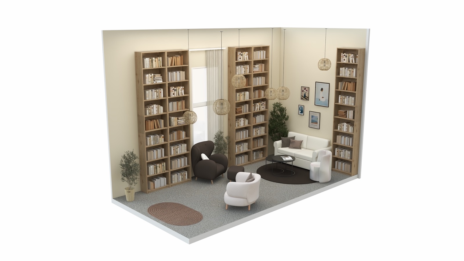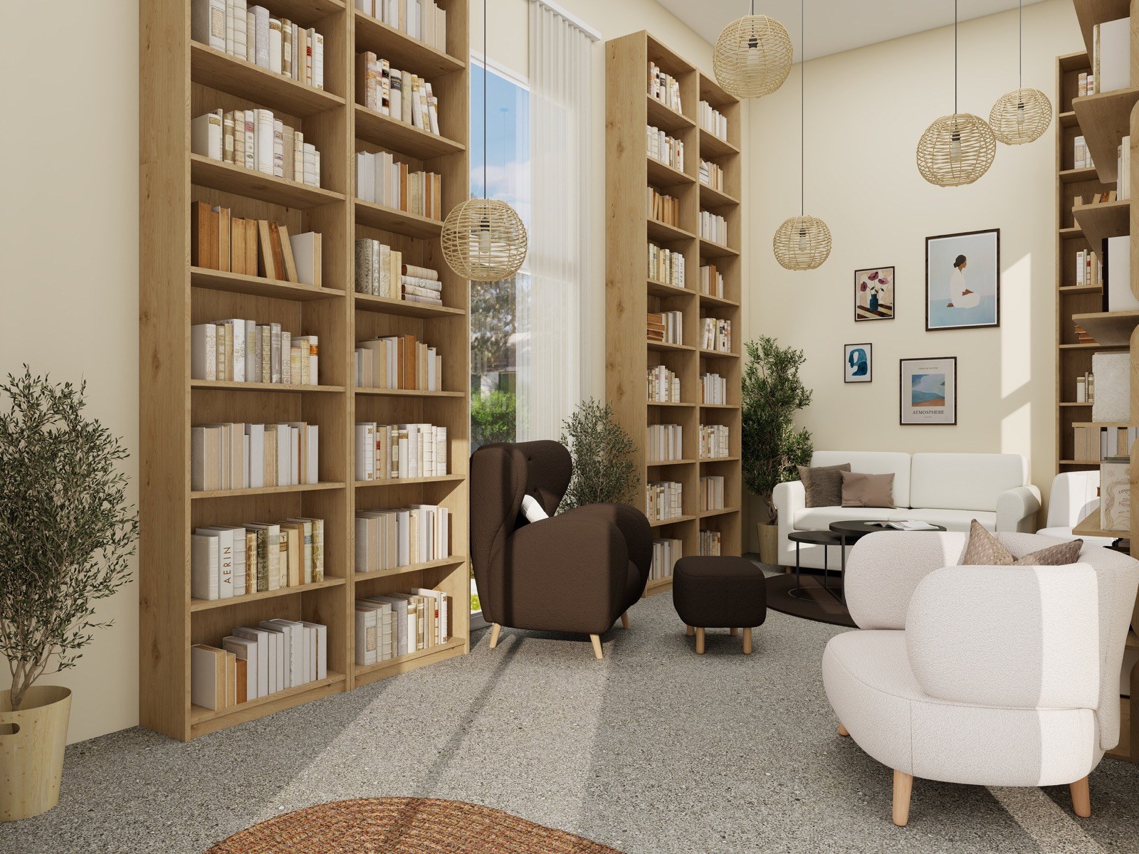 V prostoru se nahaja več knjižnih polic v lesu, ki knjižnici dajejo občutek strukture in značaja, obenem pa ponujajo veliko prostora za knjige in dekorativne elemente. Osrednji del dopolnjuje sedežna garnitura ter več udobnih naslanjačev, ki ustvarjajo različne kotičke za branje, sprostitev ali pogovor.