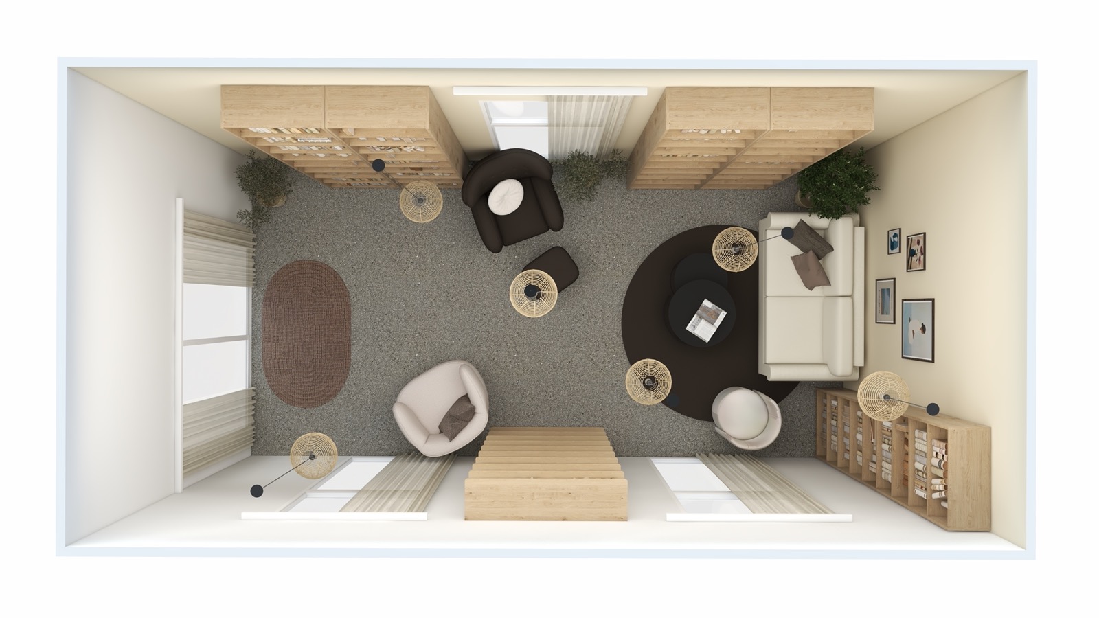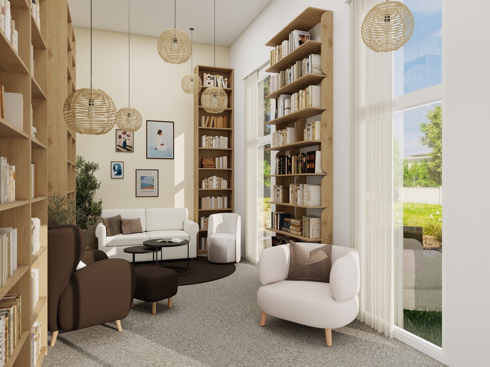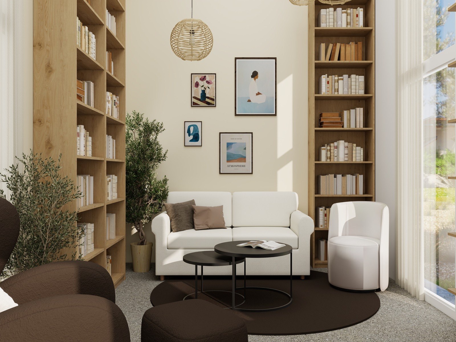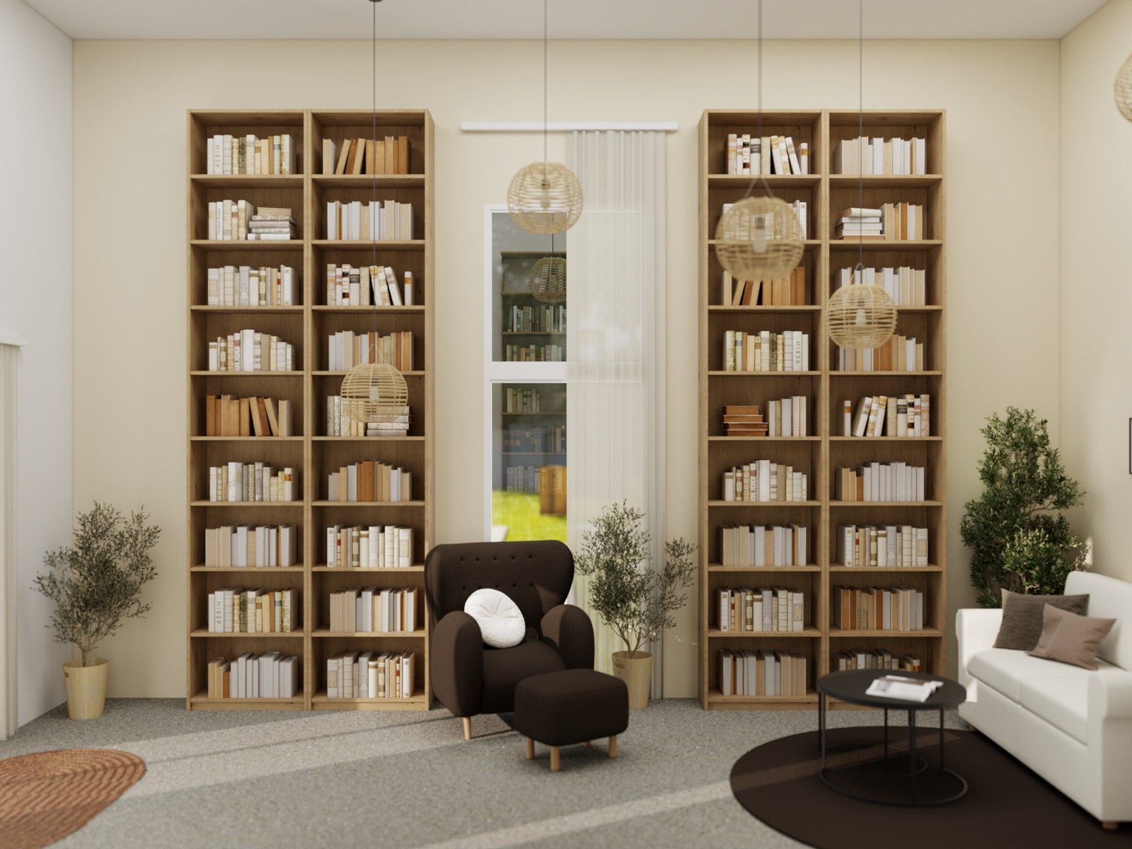 V prostoru se nahaja več knjižnih polic v lesu, ki knjižnici dajejo občutek strukture in značaja, obenem pa ponujajo veliko prostora za knjige in dekorativne elemente. Osrednji del dopolnjuje sedežna garnitura ter več udobnih naslanjačev, ki ustvarjajo različne kotičke za branje, sprostitev ali pogovor.