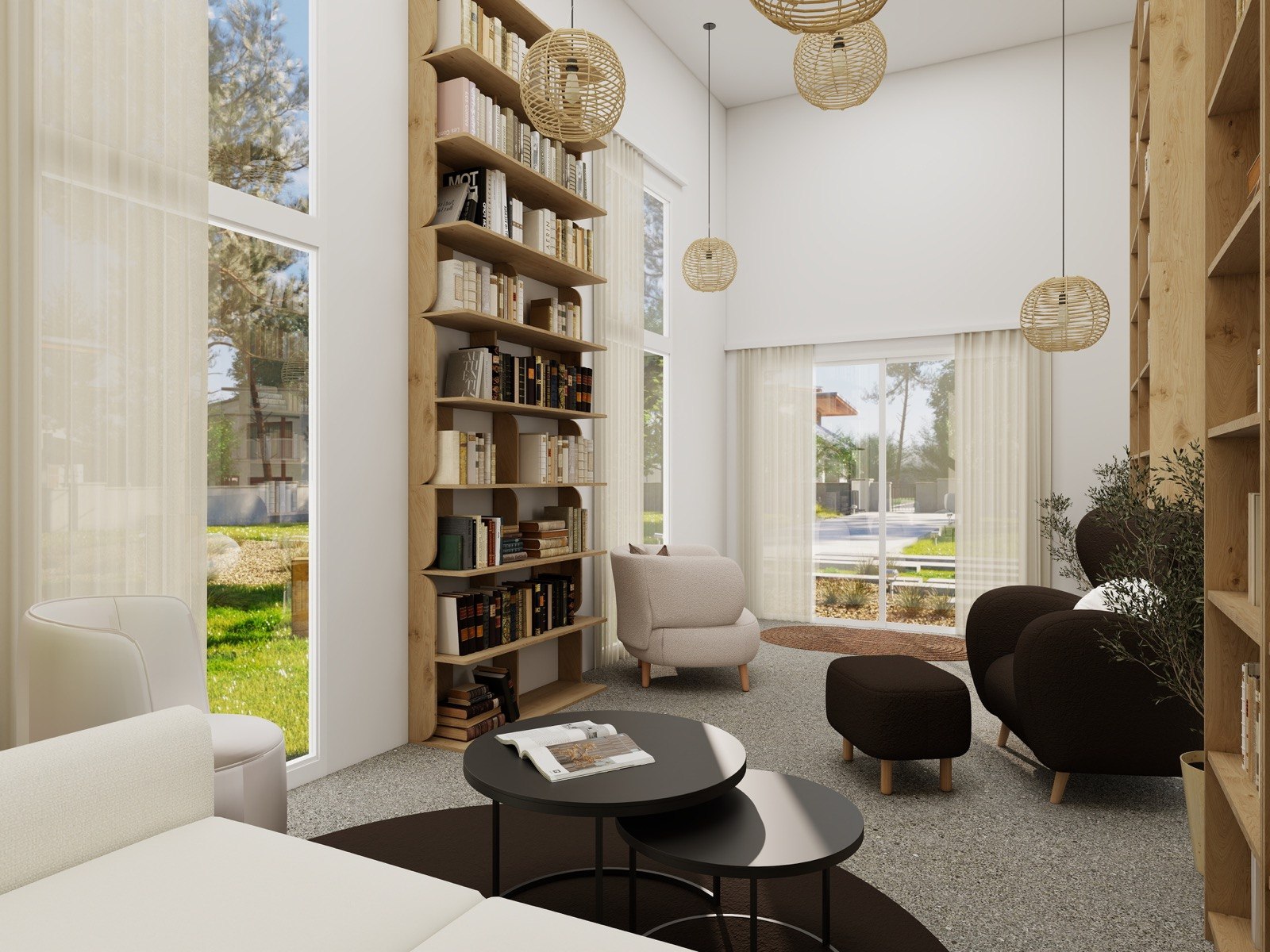 Sodobno zasnovana modularna knjižnica, ustvarjena kot prostor miru, znanja in prijetnega druženja. S svojo višino, kar 4 metre deluje odprto, zračno in prestižno, hkrati pa ohranja toplino domačega ambienta. Nevtralne, svetle stene ustvarjajo brezčasno osnovo, ki omogoča, da v ospredje stopijo naravni materiali in premišljena razporeditev opreme.