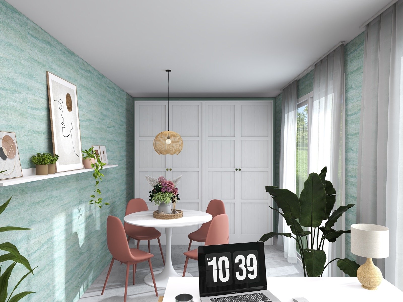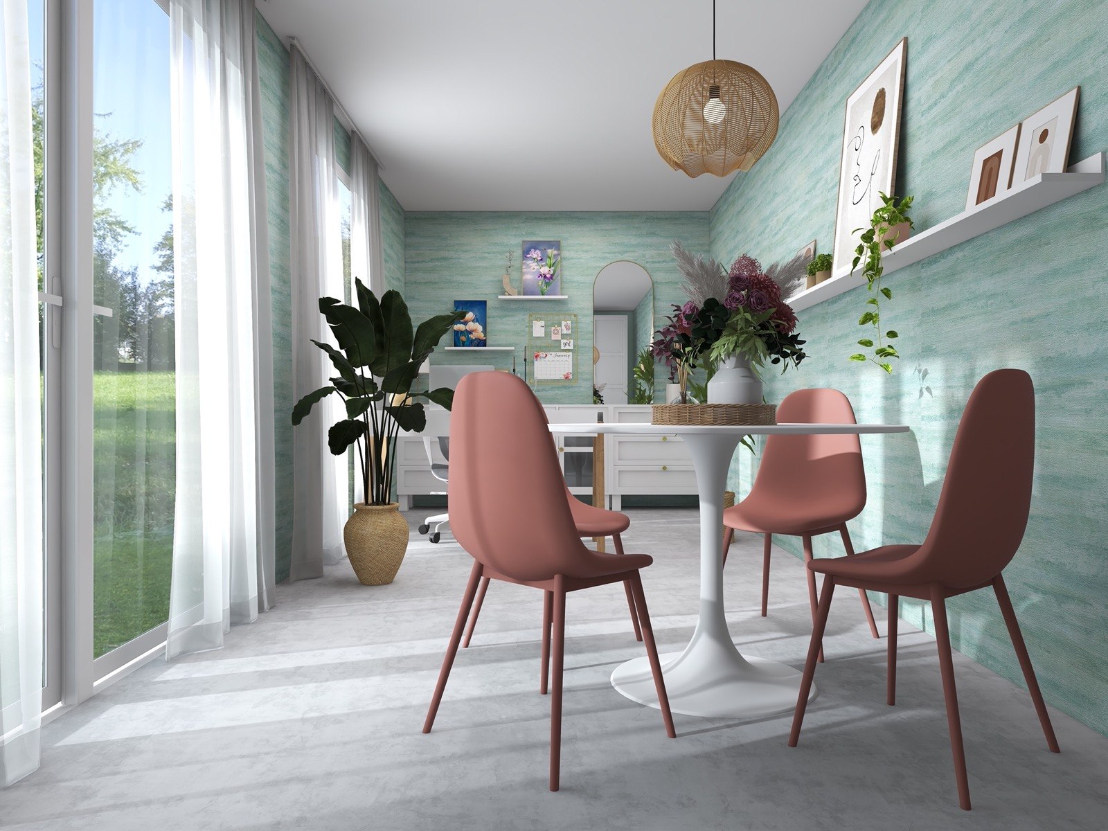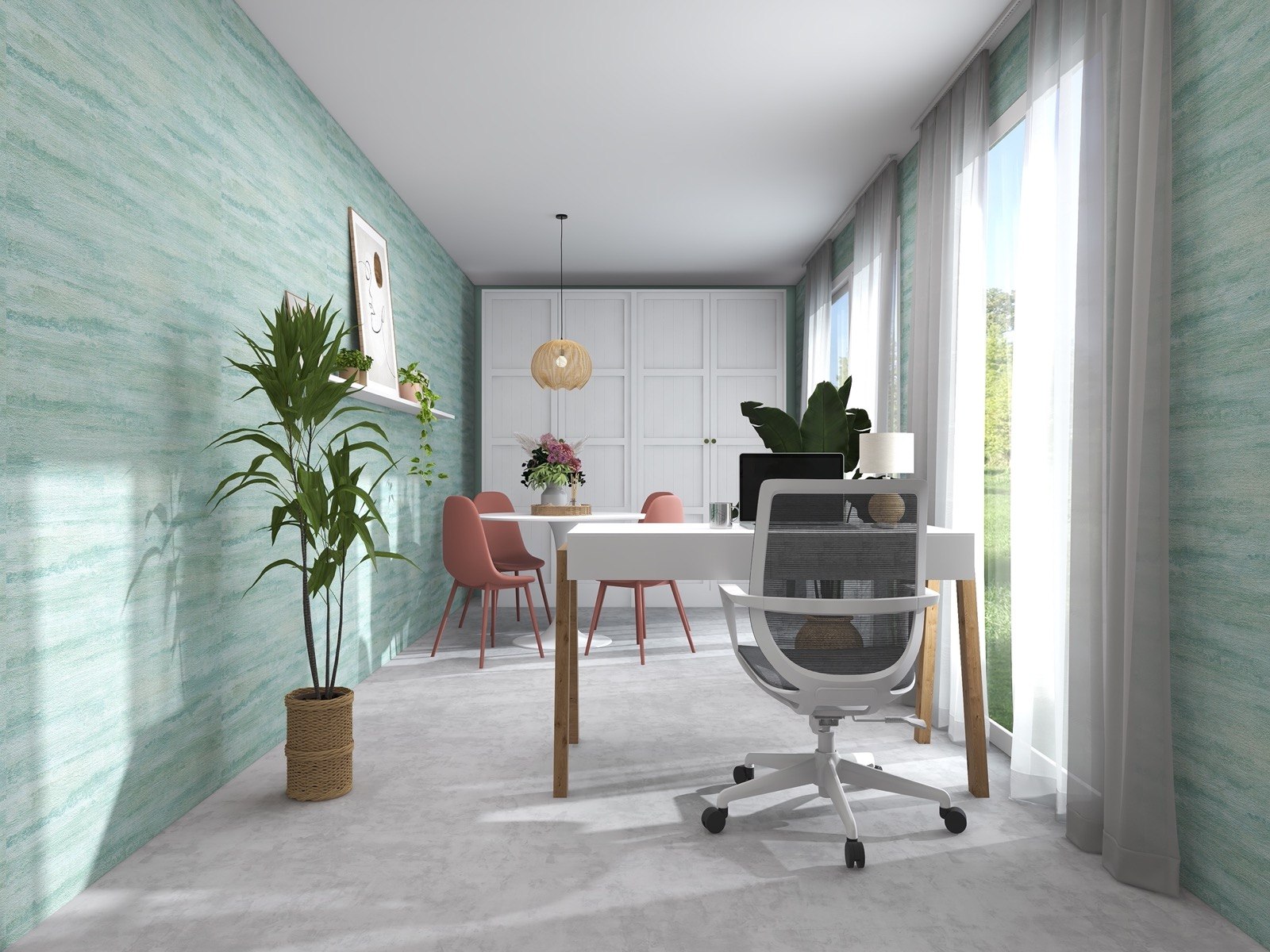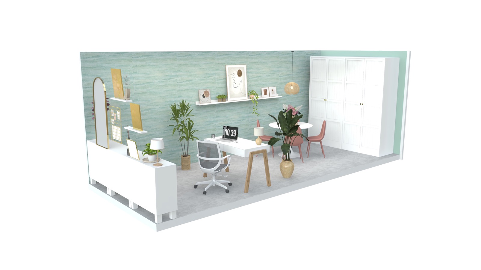 Hosekra Modular pisarna Cosmo je popoln prostor za delo, sestanke in sprostitev. Na stenah vas pozdravlja tapeta v pomirjujoči turkizni barvi, ki prinaša svežino in navdih. Oprema v beli barvi vključuje veliko pisalno mizo, nizke omarice za shranjevanje in odlaganje, ter okroglo mizo s štirimi stoli, ki je primerna za sestanke, malico ali druženje. Na drugi strani prostora je velika omara za shranjevanje, ki zagotavlja dovolj prostora za vse vaše potrebščine.