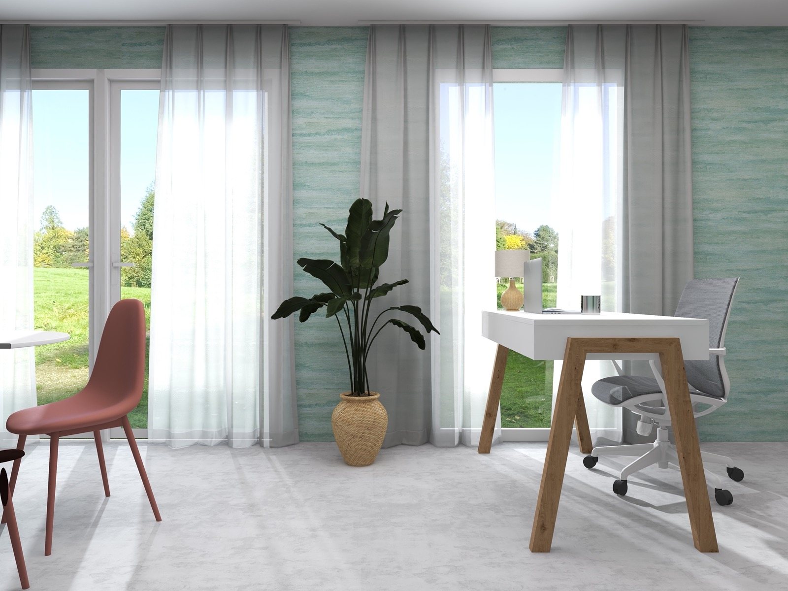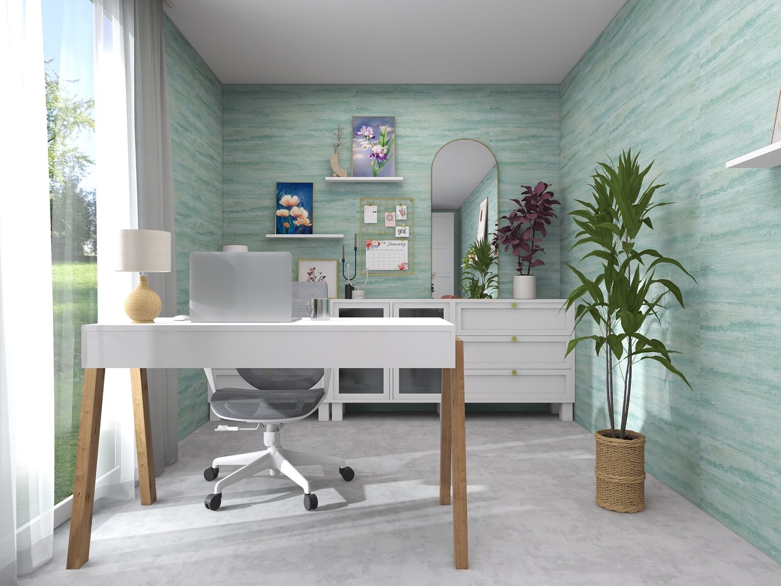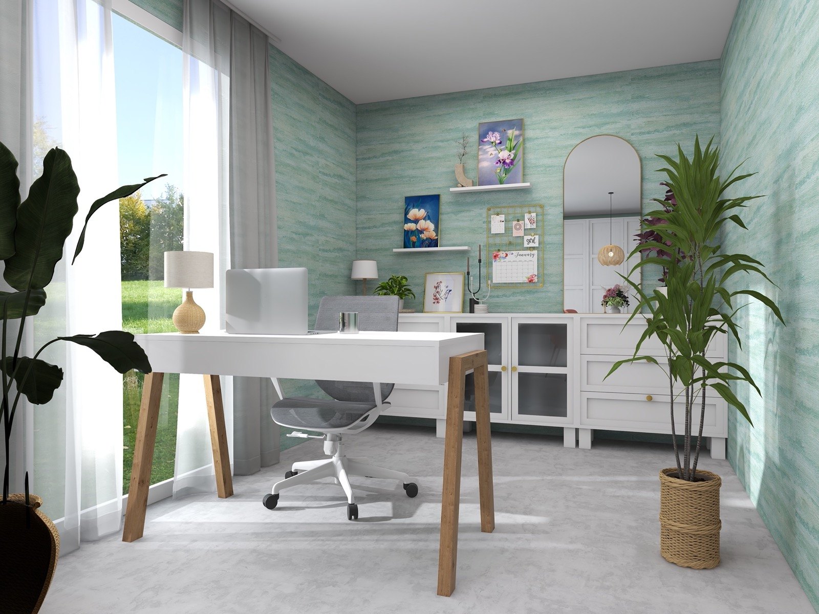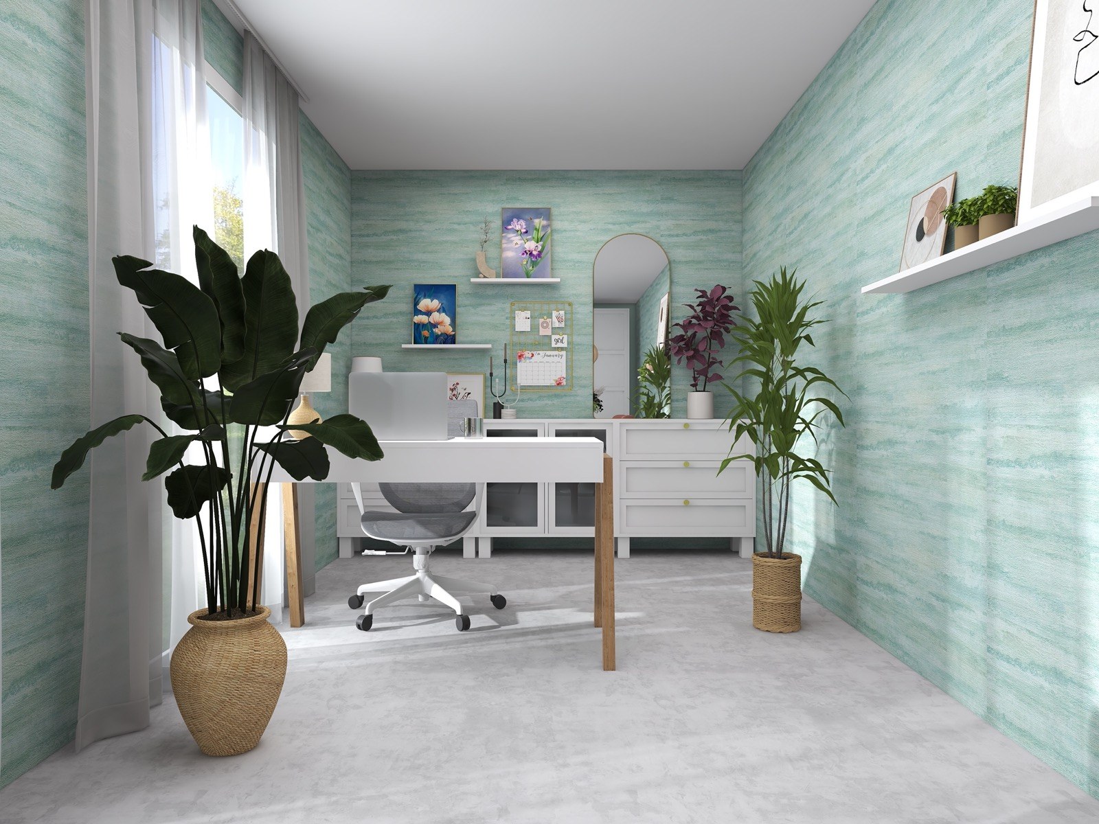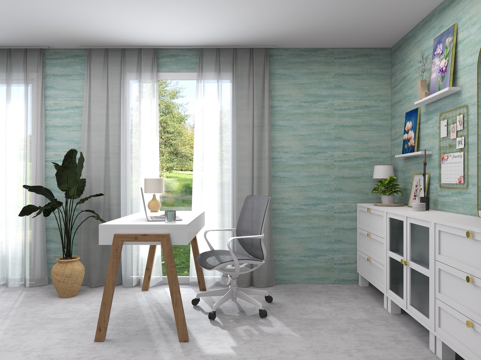 Hosekra Modular pisarna Cosmo je popoln prostor za delo, sestanke in sprostitev. Na stenah vas pozdravlja tapeta v pomirjujoči turkizni barvi, ki prinaša svežino in navdih. Oprema v beli barvi vključuje veliko pisalno mizo, nizke omarice za shranjevanje in odlaganje, ter okroglo mizo s štirimi stoli, ki je primerna za sestanke, malico ali druženje. Na drugi strani prostora je velika omara za shranjevanje, ki zagotavlja dovolj prostora za vse vaše potrebščine.