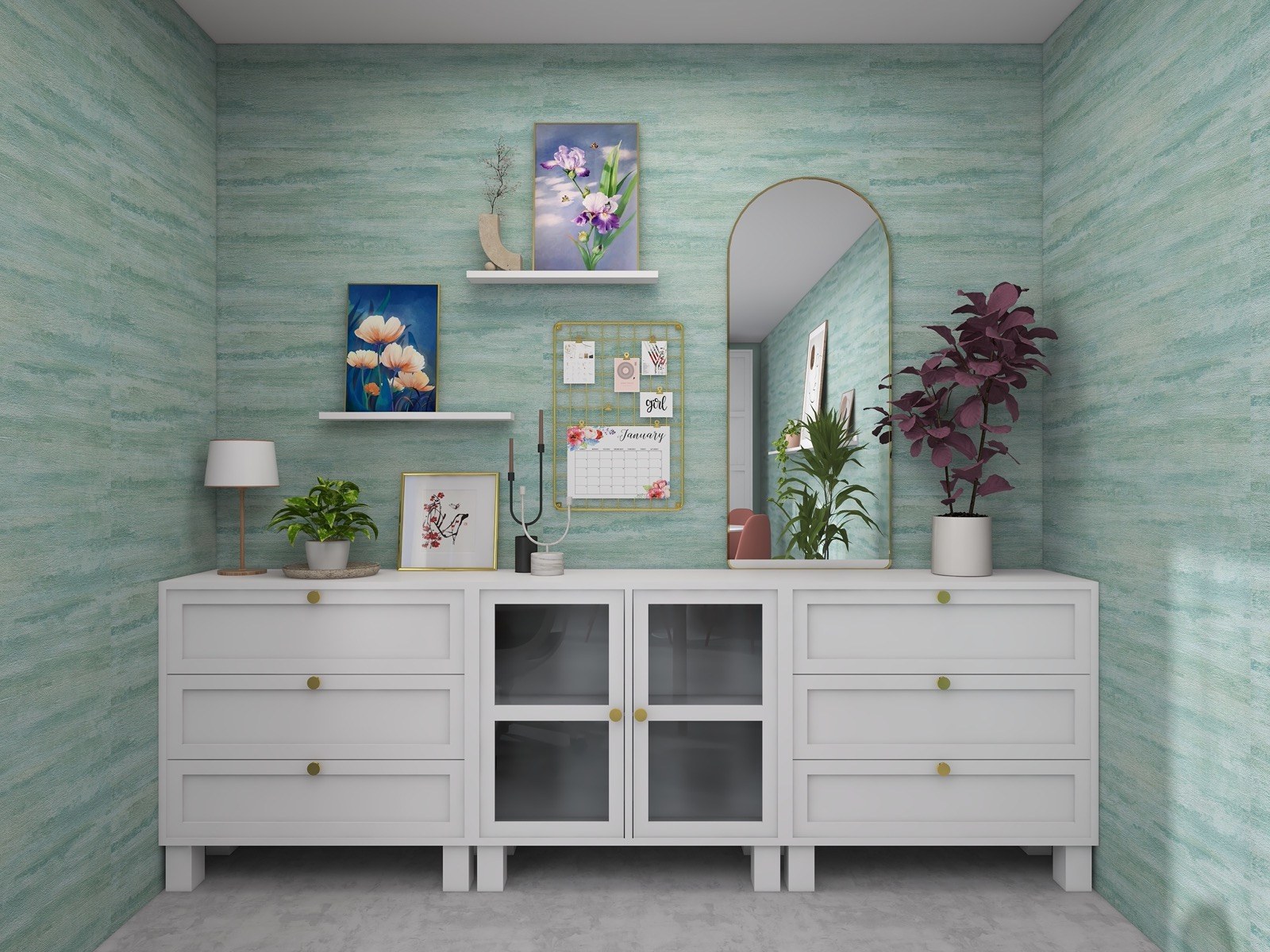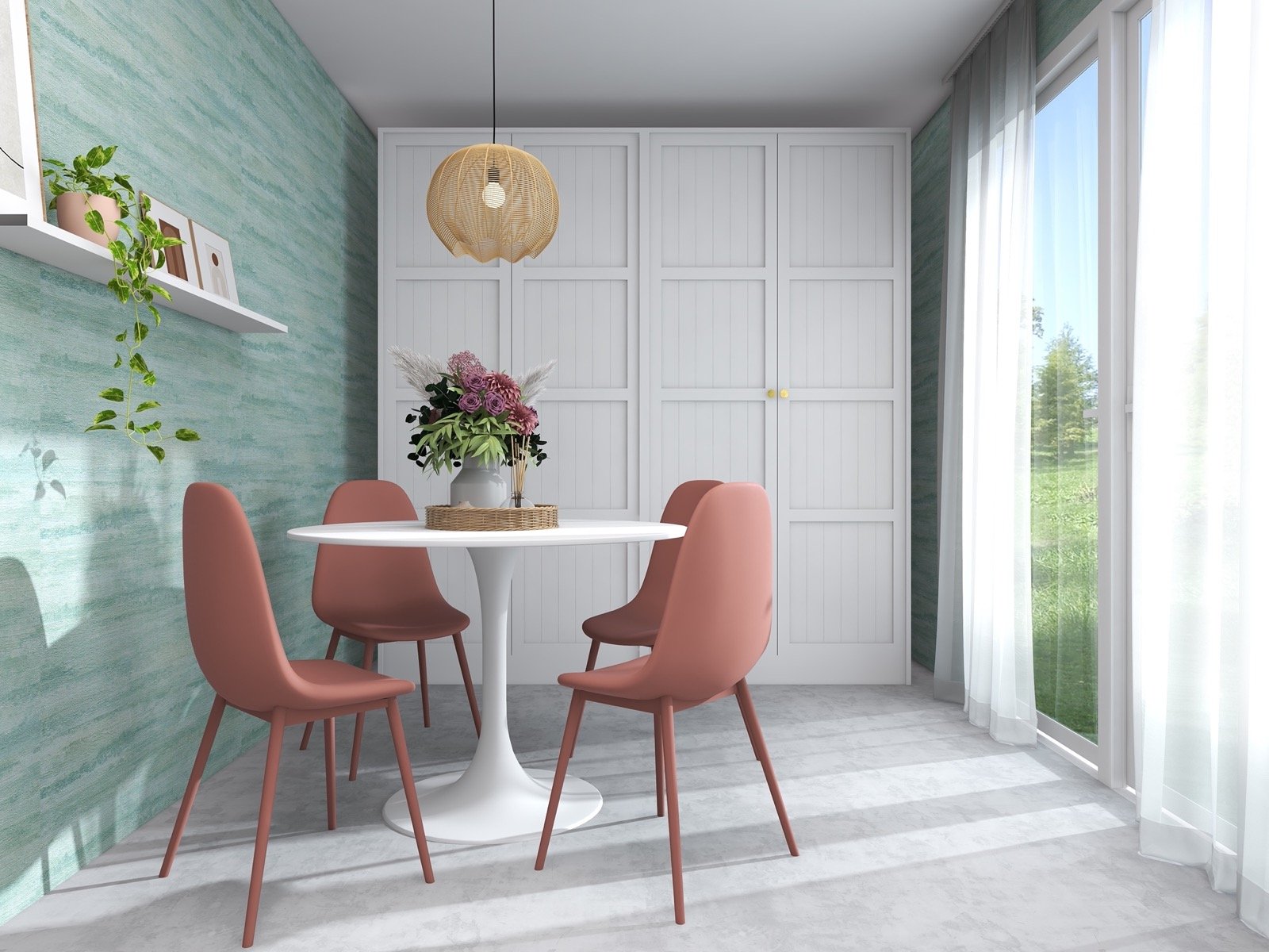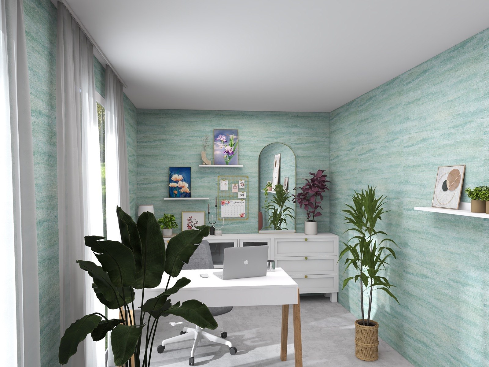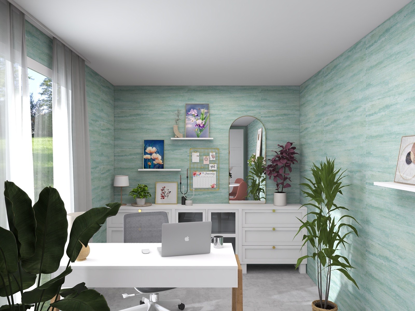 Hosekra Modular pisarna Cosmo je popoln prostor za delo, sestanke in sprostitev. Na stenah vas pozdravlja tapeta v pomirjujoči turkizni barvi, ki prinaša svežino in navdih. Oprema v beli barvi vključuje veliko pisalno mizo, nizke omarice za shranjevanje in odlaganje, ter okroglo mizo s štirimi stoli, ki je primerna za sestanke, malico ali druženje. Na drugi strani prostora je velika omara za shranjevanje, ki zagotavlja dovolj prostora za vse vaše potrebščine.