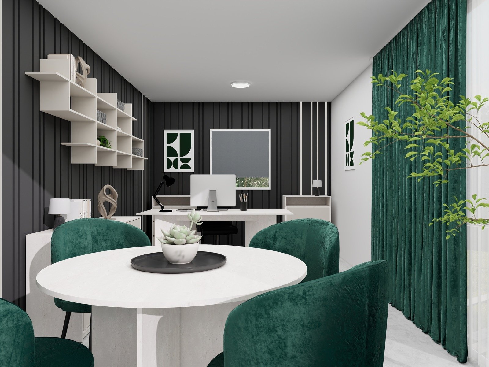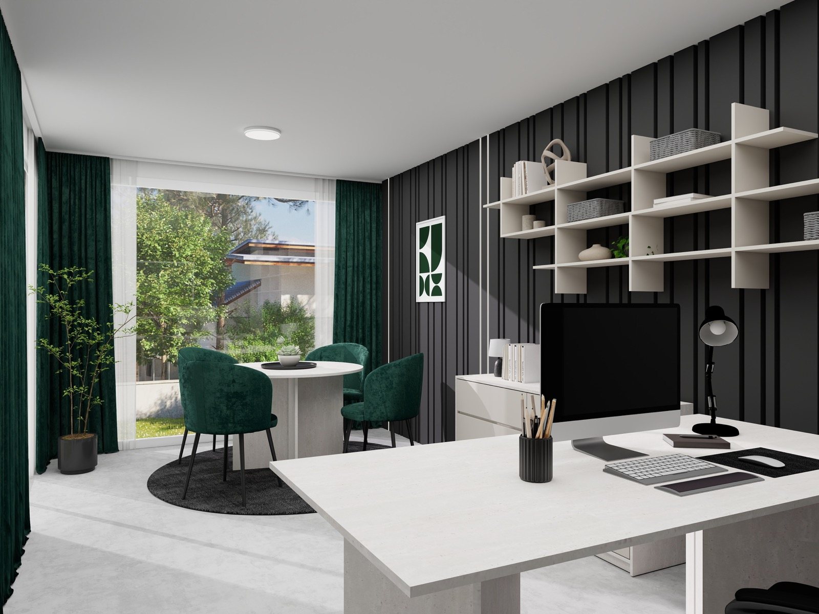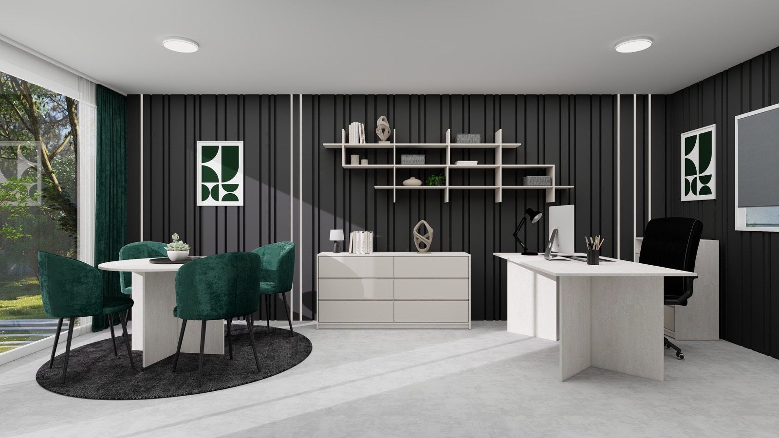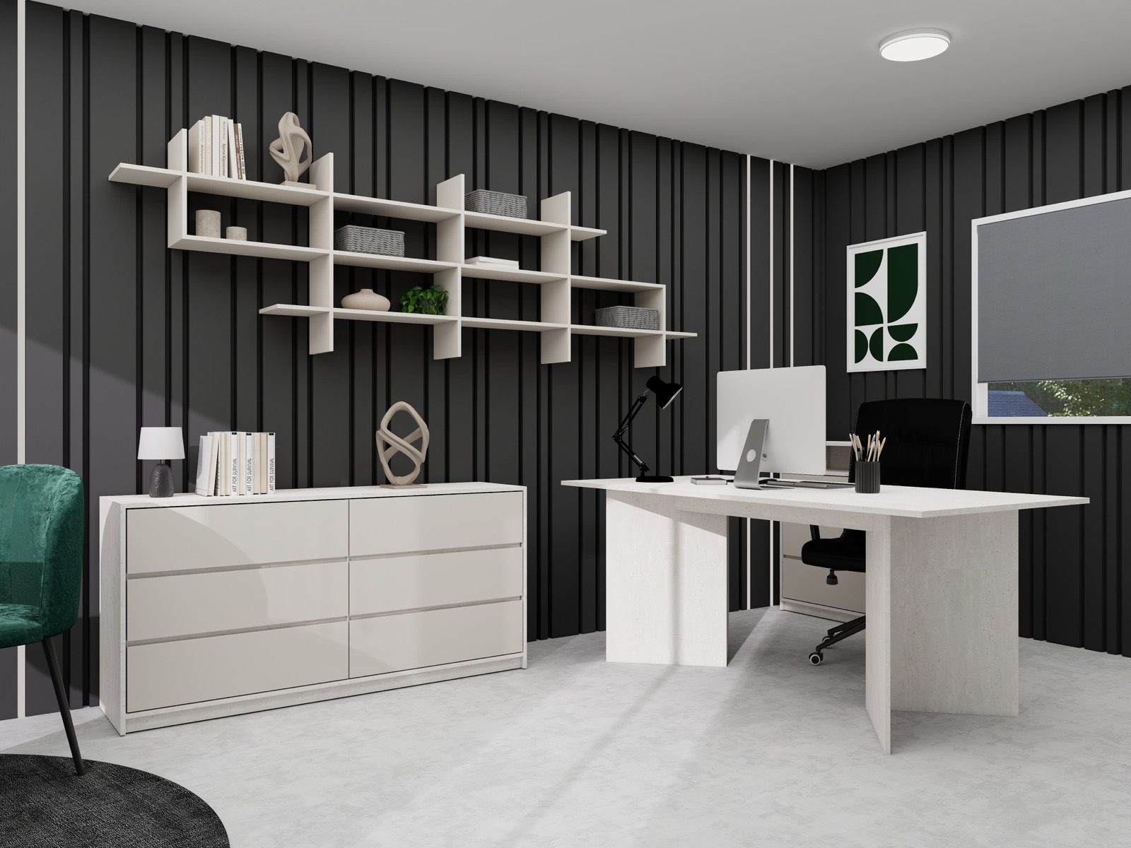 Hosekra Modular pisarna REGENT je zasnovana kot prefinjen in sodoben delovni prostor, kjer se eleganca temnih površin prepleta s svetlim pohištvom in naravnimi poudarki. Kontrast med temno stensko oblogo z vertikalnimi linijami ter svetlimi delovnimi elementi prostoru daje izrazit, a uravnotežen značaj.