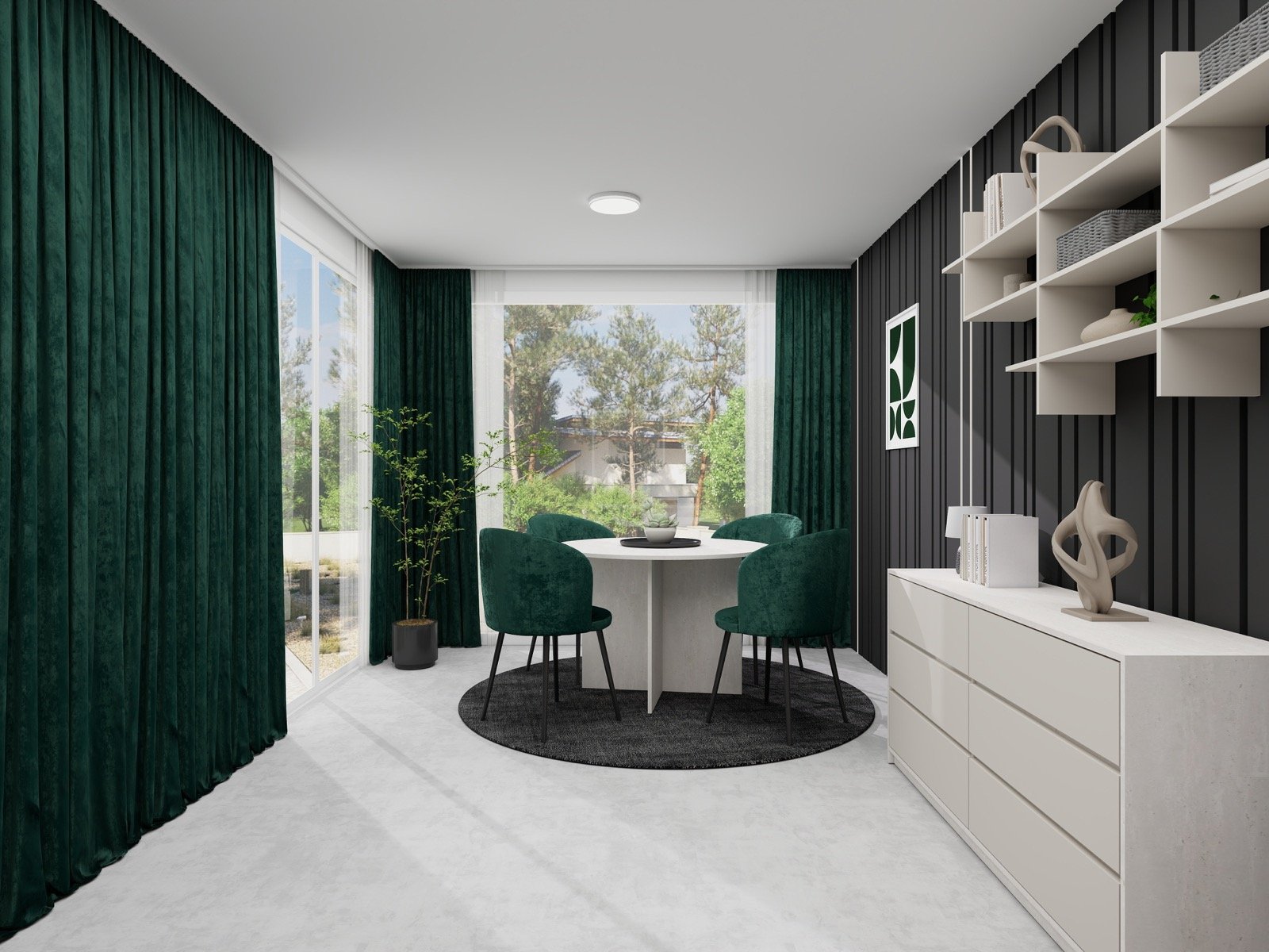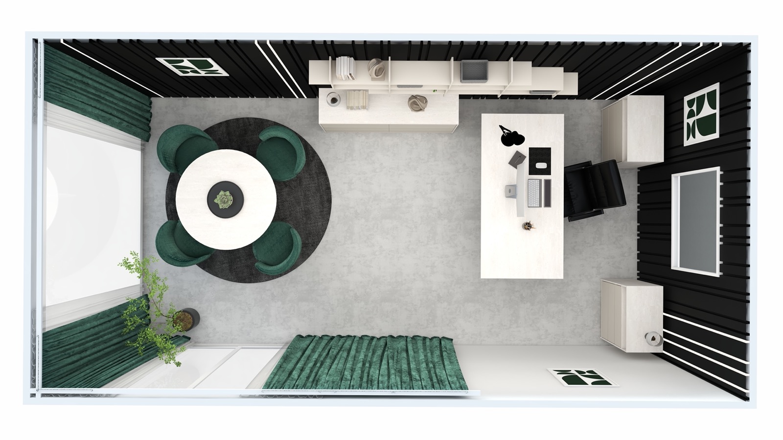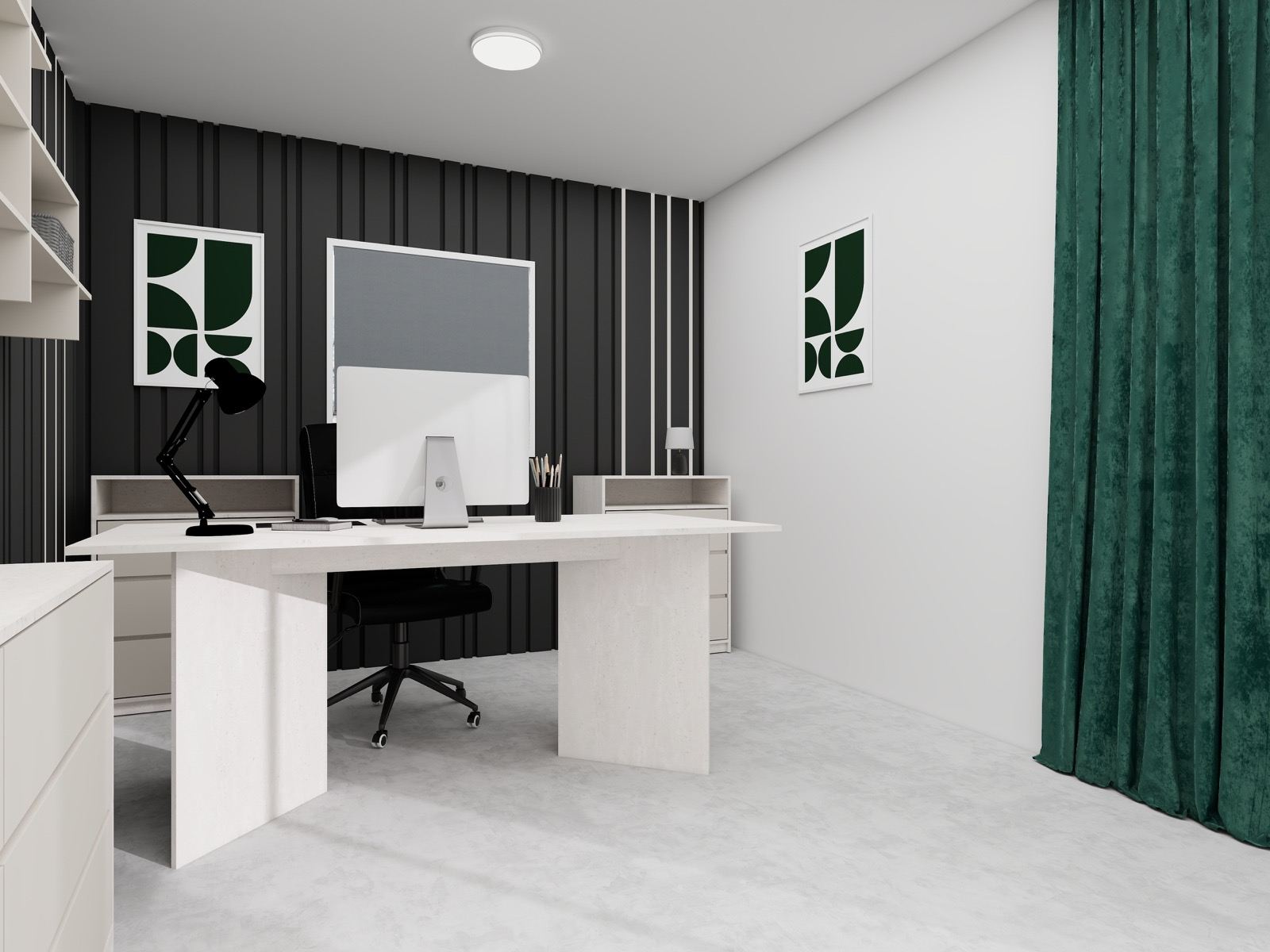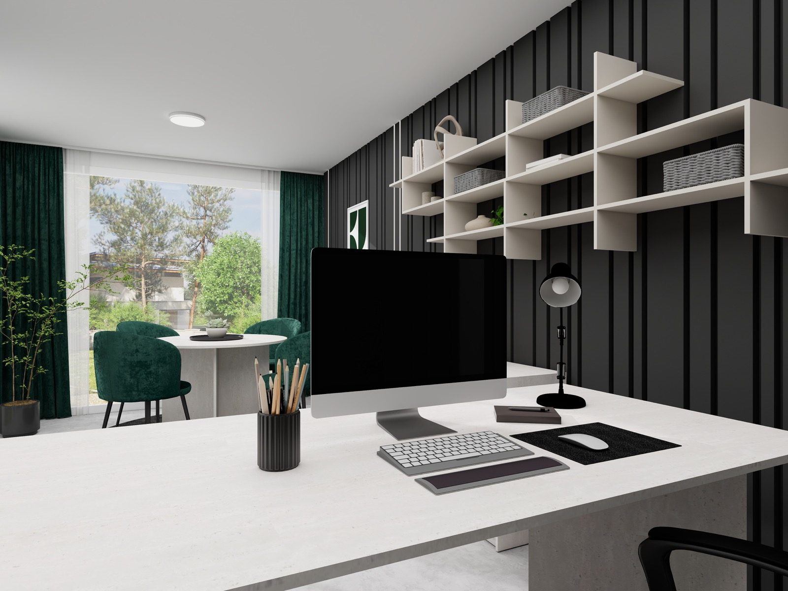 Hosekra Modular pisarna REGENT je zasnovana kot prefinjen in sodoben delovni prostor, kjer se eleganca temnih površin prepleta s svetlim pohištvom in naravnimi poudarki. Kontrast med temno stensko oblogo z vertikalnimi linijami ter svetlimi delovnimi elementi prostoru daje izrazit, a uravnotežen značaj.