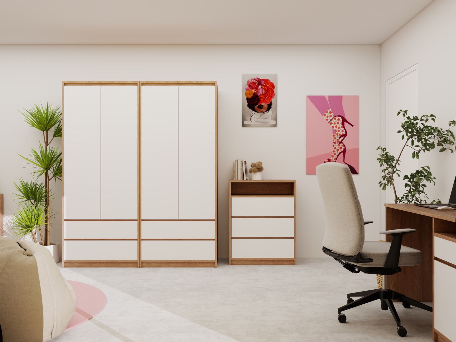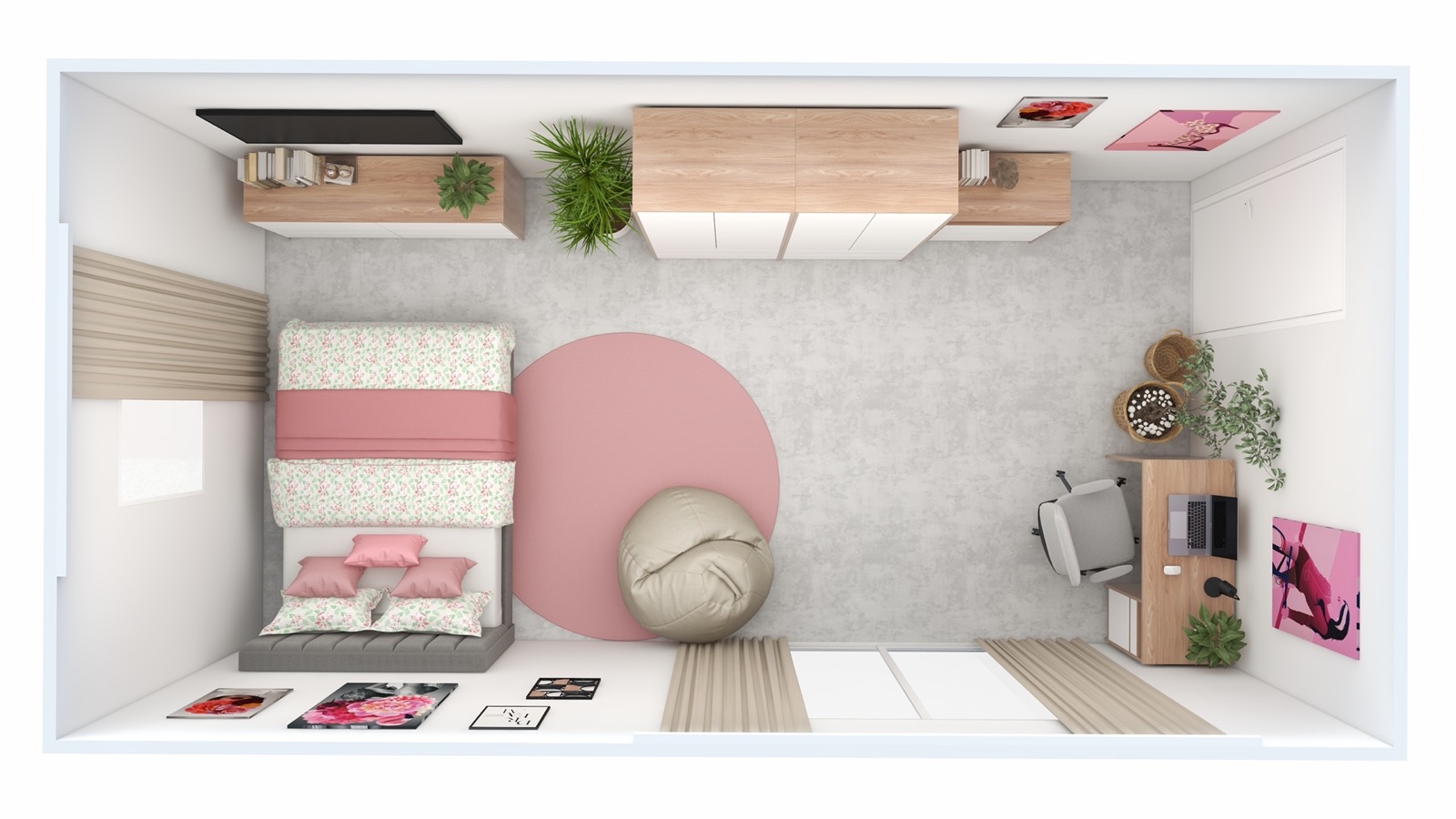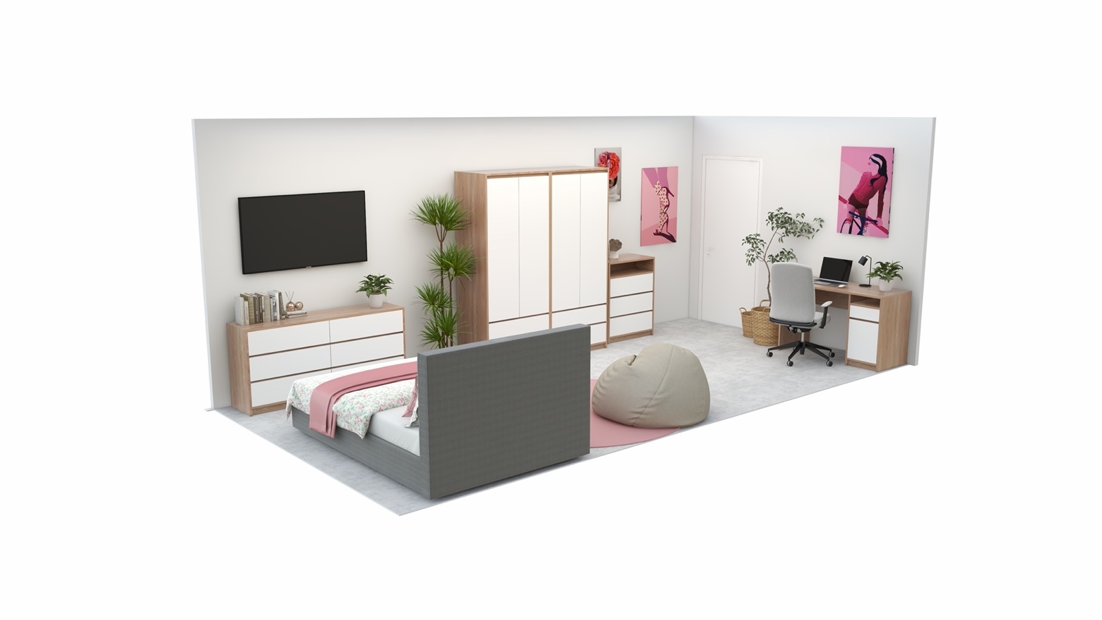 Hosekra Modular mladinska soba BLOSSOM je zasnovana kot svetel, prijeten in harmoničen prostor, ki spodbuja občutek varnosti, ustvarjalnosti in dobrega počutja. Mehki rožnati in bež odtenki ustvarjajo nežno barvno kuliso, ki deluje umirjeno, a hkrati sodobno in igrivo.