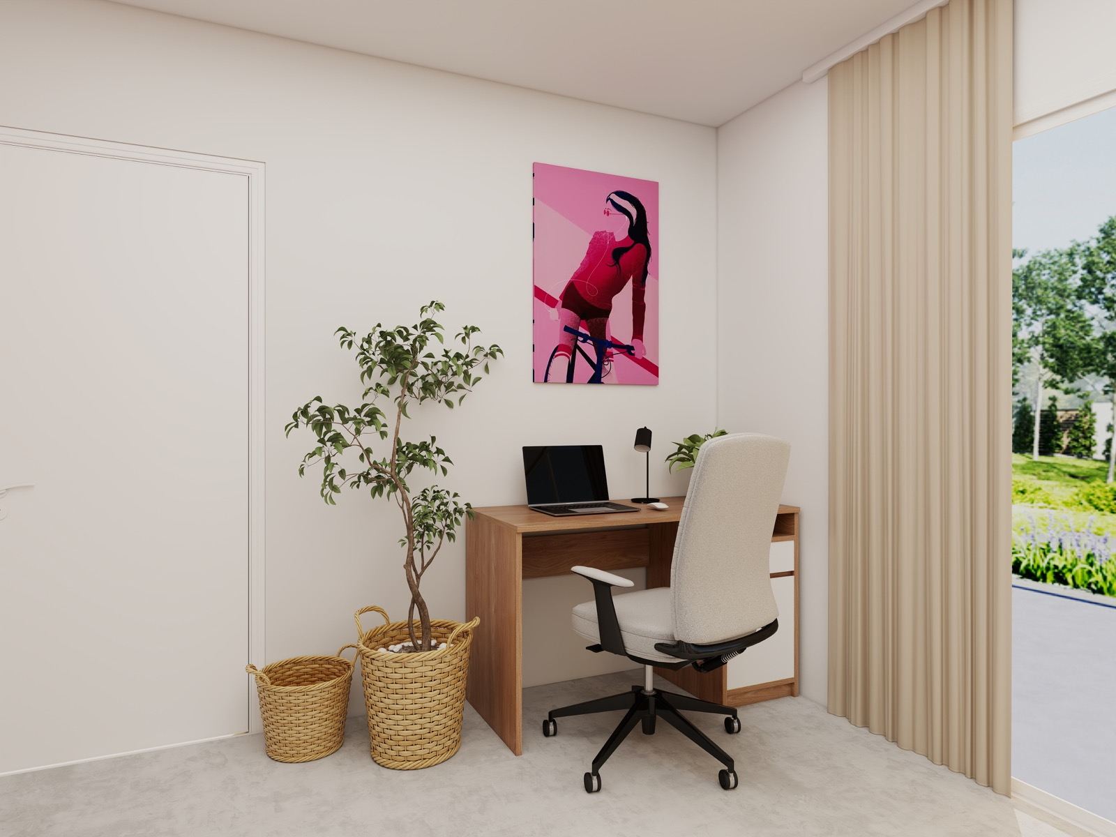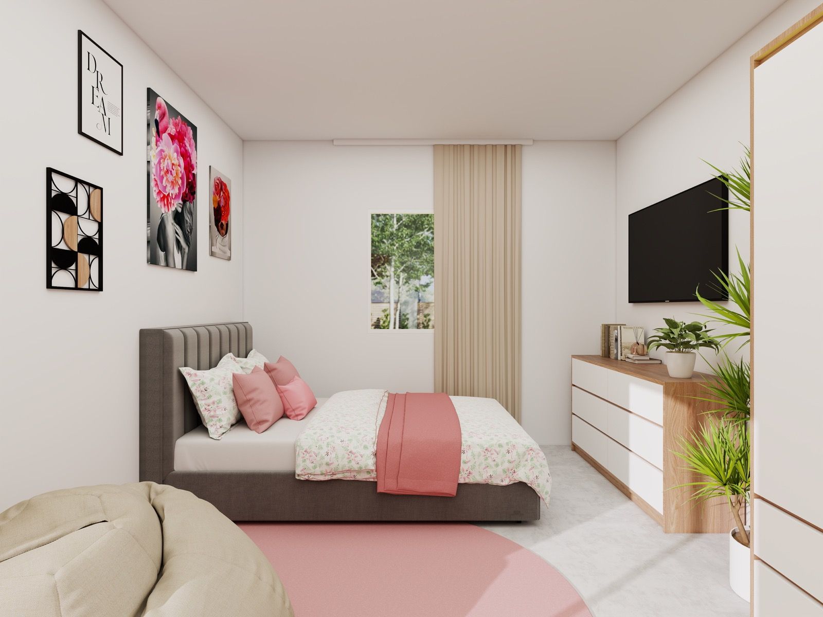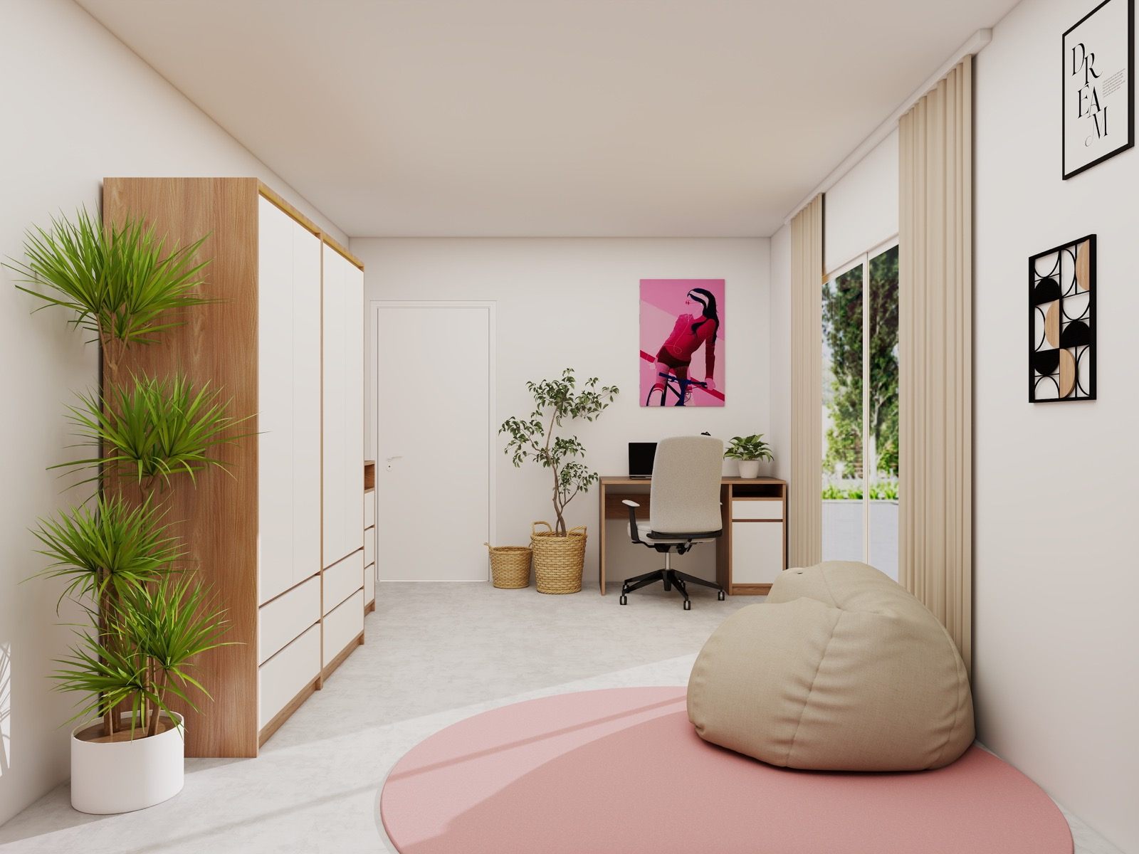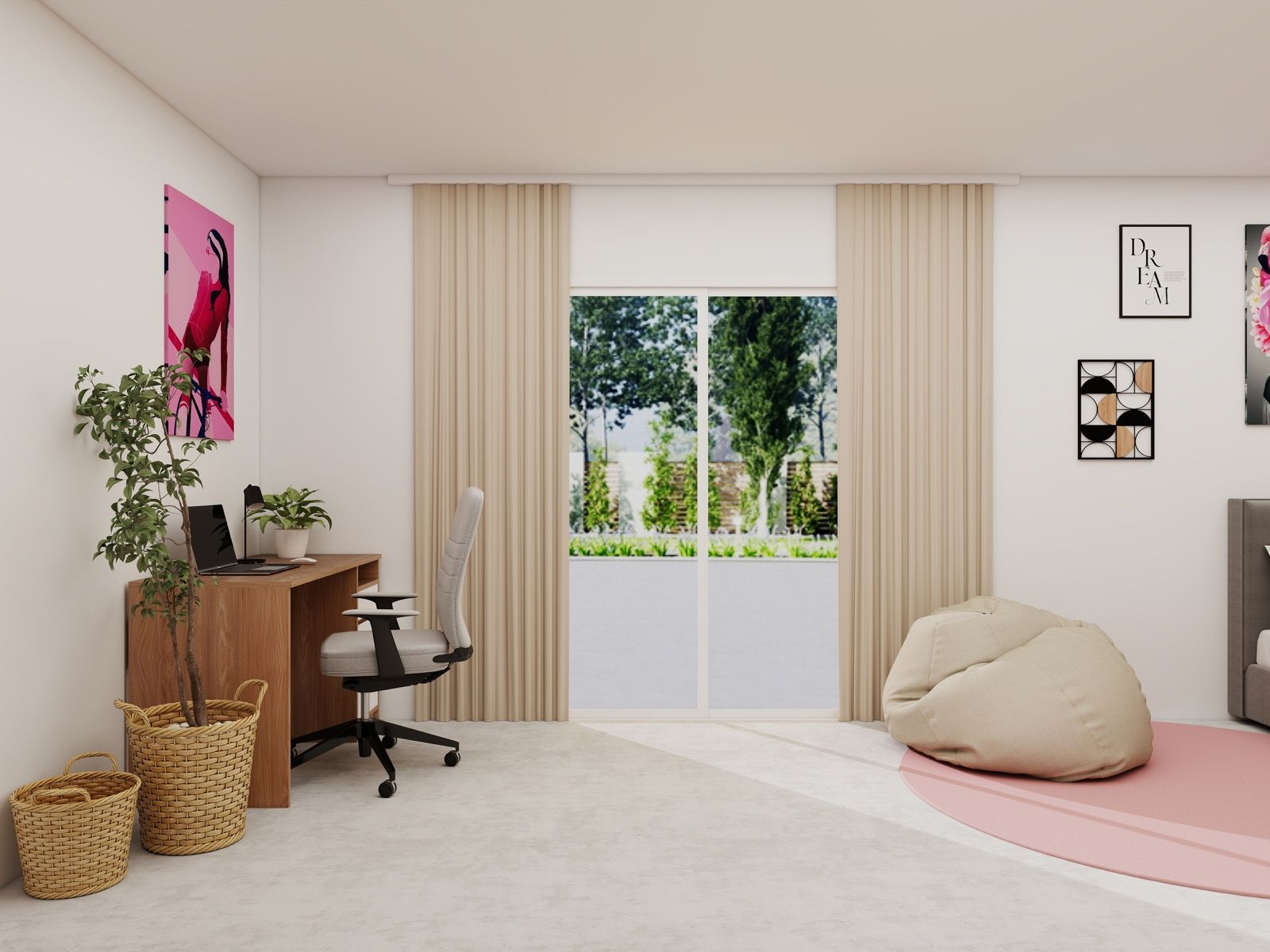 Pohištvo v toplih, naravnih tonih prostora ne obremeni, temveč ga vizualno odpre in poveže v celoto. Premišljeno razporejeni elementi omogočajo funkcionalno uporabo prostora za učenje, počitek in prosti čas, medtem ko dekorativni detajli in tekstil dodajo osebno noto ter občutek domačnosti.
