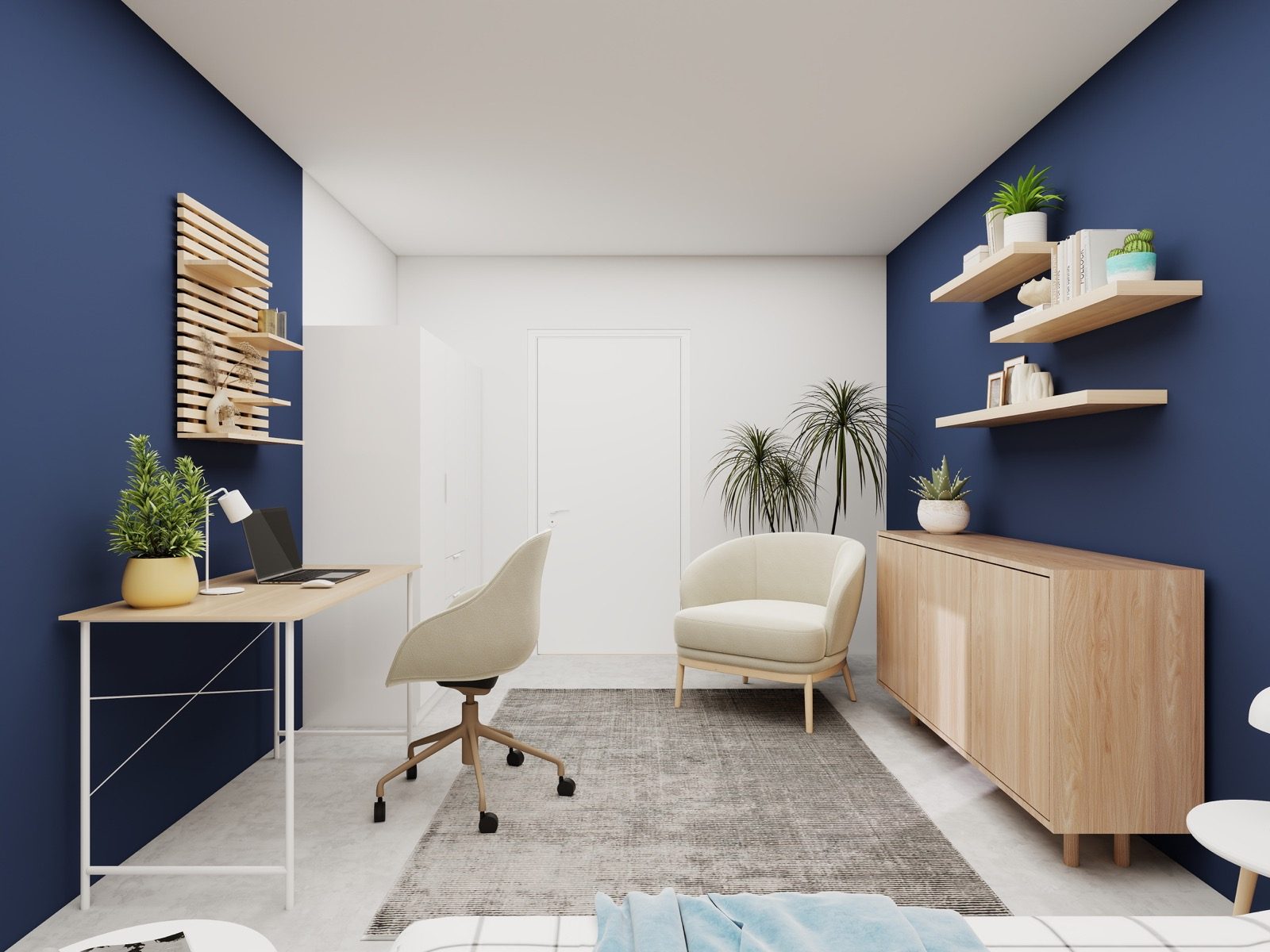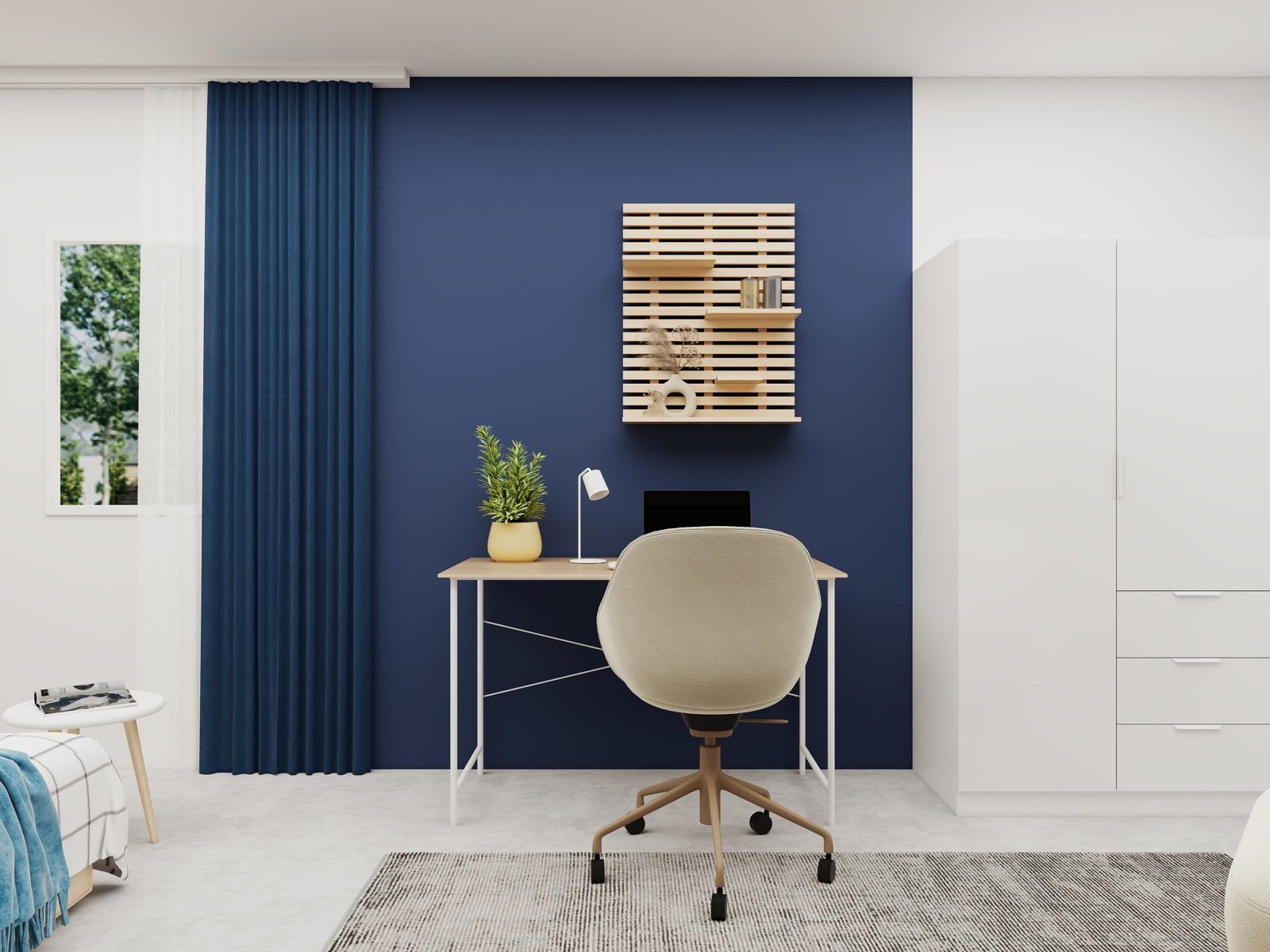 Hosekra Modular mladinska soba PULSE je zasnovana kot sodoben, funkcionalen in estetsko uravnotežen prostor za odraščanje, učenje in počitek. Nevtralna barvna osnova ustvarja mirno okolje, ki ga poživi poudarjena stena z lesnim panelom v tirolsko modrem odtenku. Isti panel se ponovi tudi v delu s pisalno mizo in prostoru doda vizualno povezanost ter značaj.