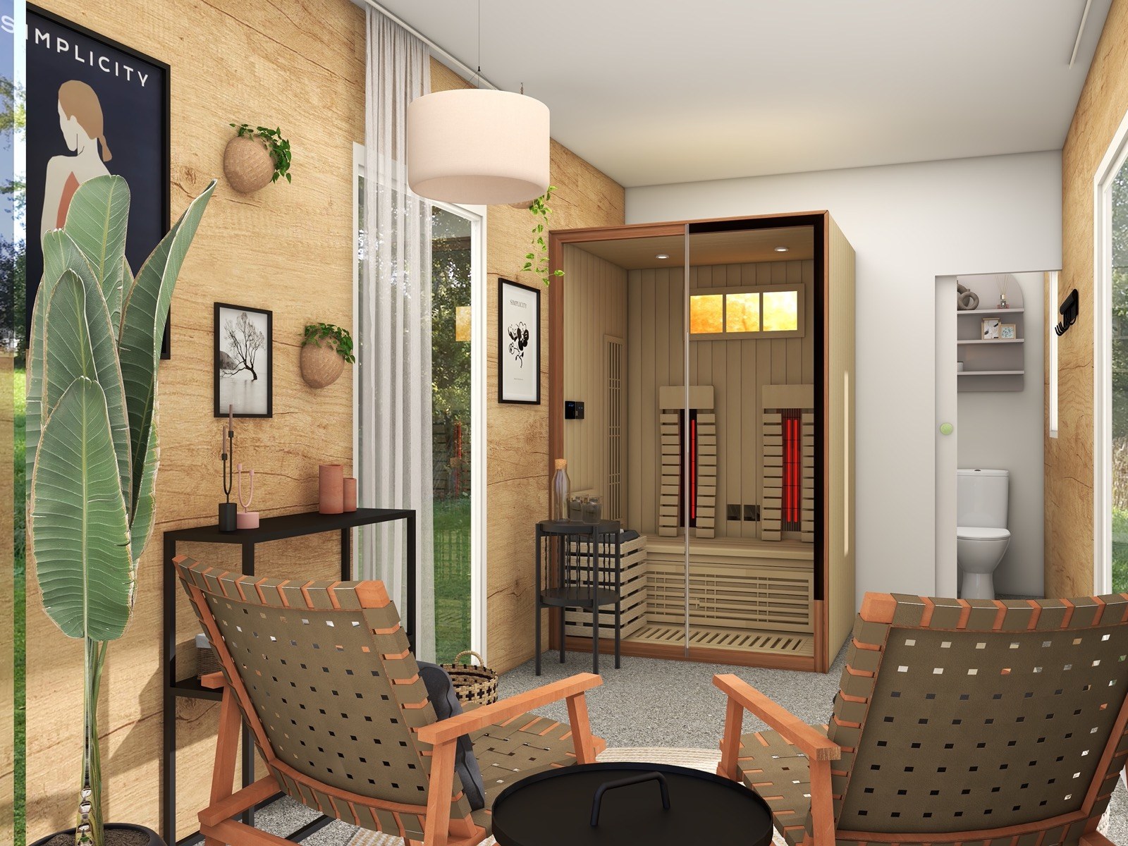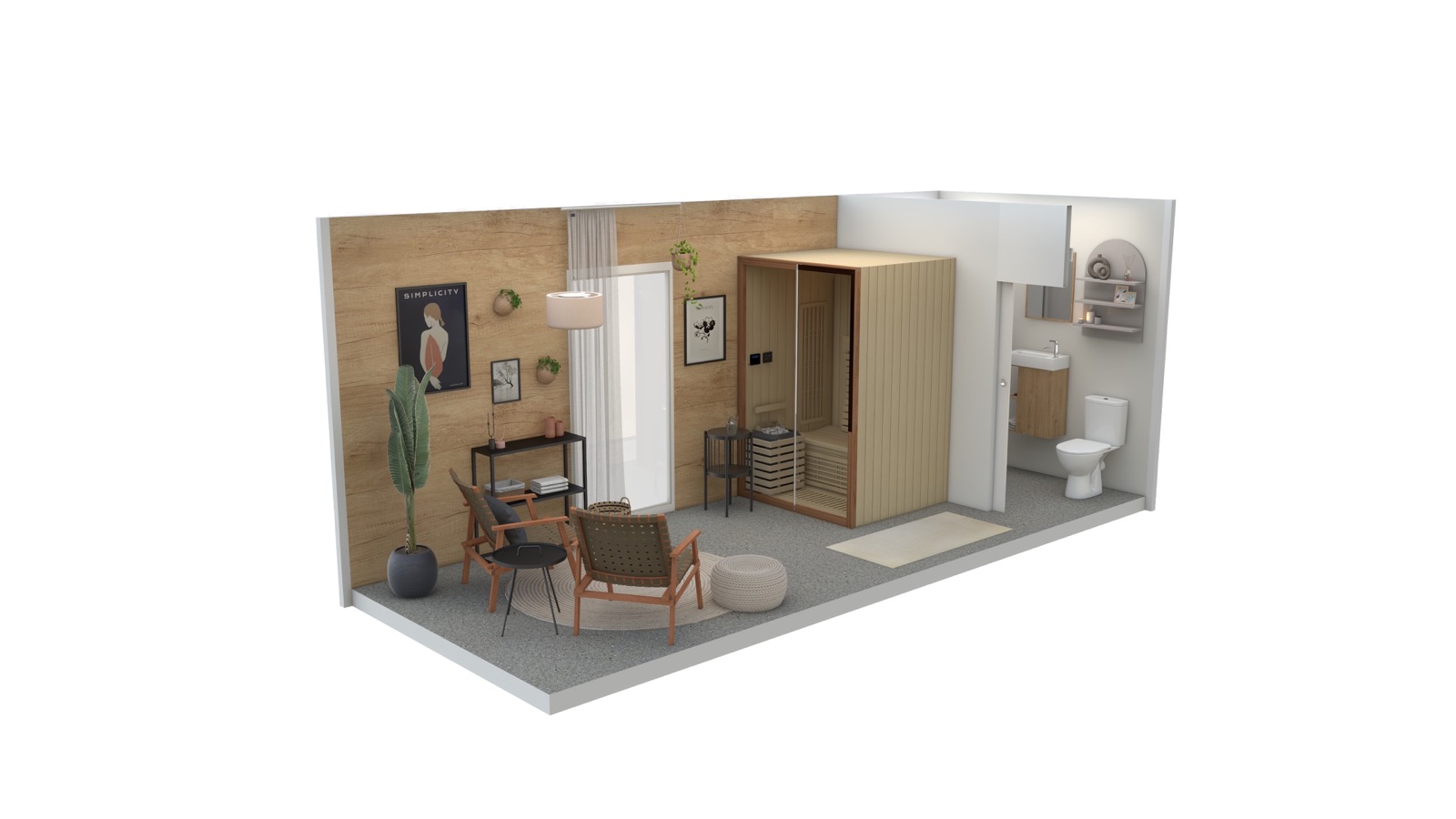 Hosekra Modular wellness Harmony je več kot le wellness prostor – je vaša osebna oaza za sprostitev, luksuz in povezovanje z naravo. Z našim wellnessom boste dosegli novo raven harmonije in notranjega miru, medtem ko se boste osredotočili na svoje telo in um. Premišljena oprema prinaša razkošje in udobje v vaš vsakdan. Lesene obloge in dekorativne slike na stenah dodajajo estetsko vrednost in toplino, medtem ko rastline prinašajo dotik narave v notranjost.