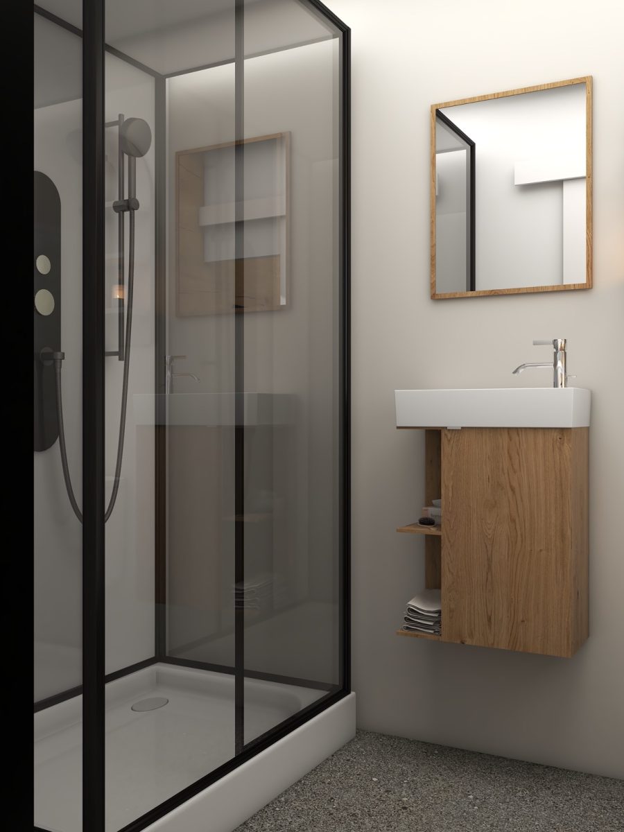 umivalnikom, ogledalom in sanitarijami, vam Harmony prinaša vse, kar potrebujete za popolno wellness izkušnjo. Steklene površine omogočajo obilico naravne svetlobe. Lesene obloge na stenah