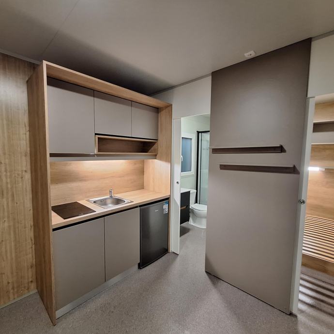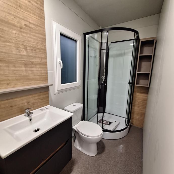 Cena je za hišico Z VSO OPREMO (kopalnica, kuhinja, dnevni prostor in 2 spalnici). Dodatno je možno naročiti tudi teraso, cena terase 3x8m je 1.890,00 + 22% DDV.