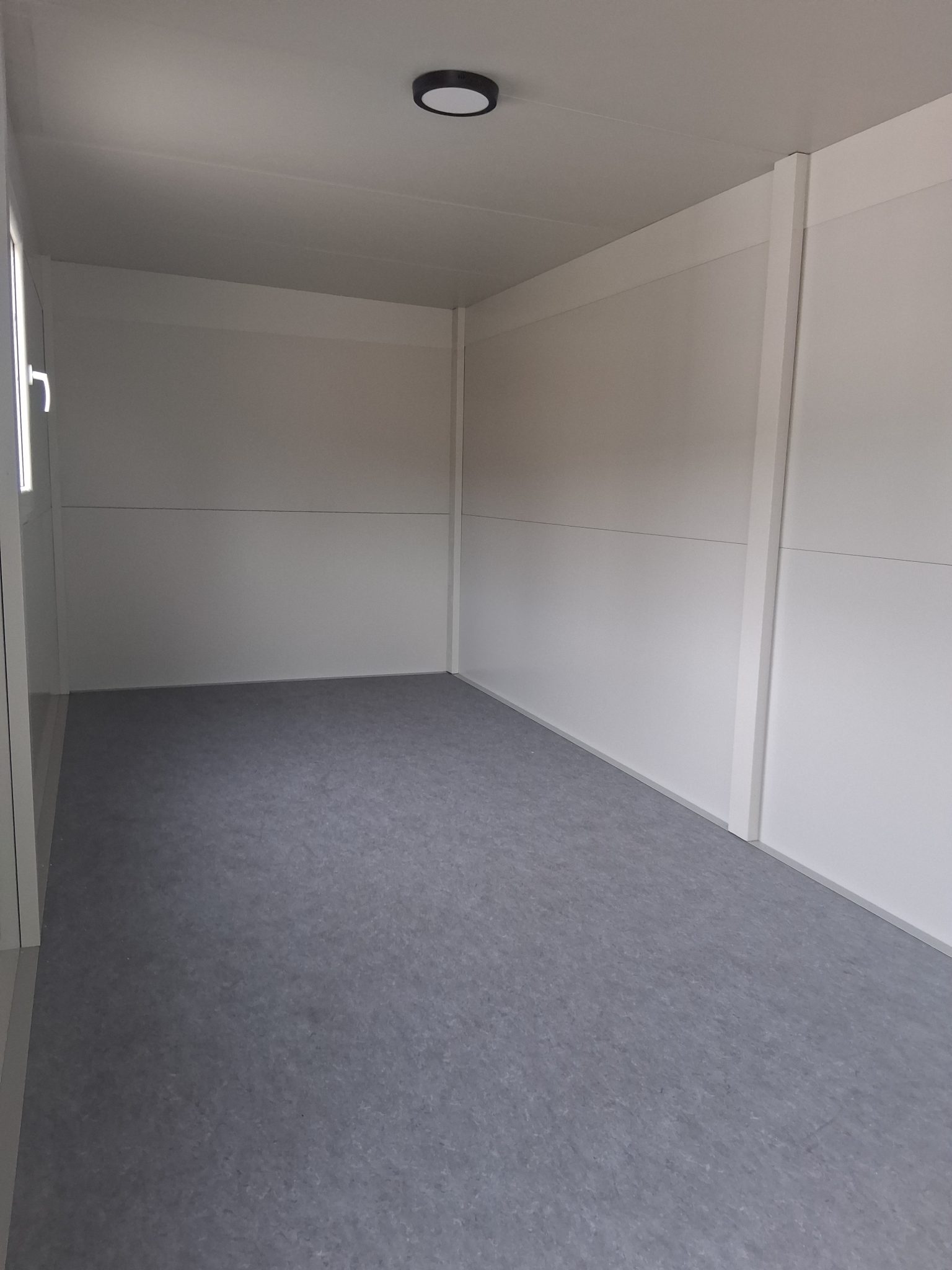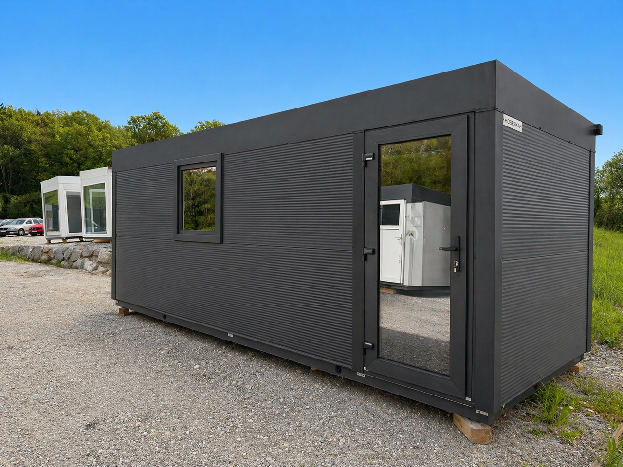 Kontejner je opremljen z velikimi steklenimi vrati in oknom, kar zagotavlja obilico naravne svetlobe ter prijeten in odprt občutek prostora. Sodobna zasnova omogoča estetsko dovršen videz, ki se lepo poda v različna okolja.