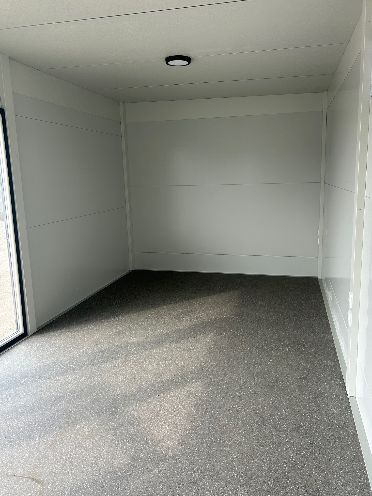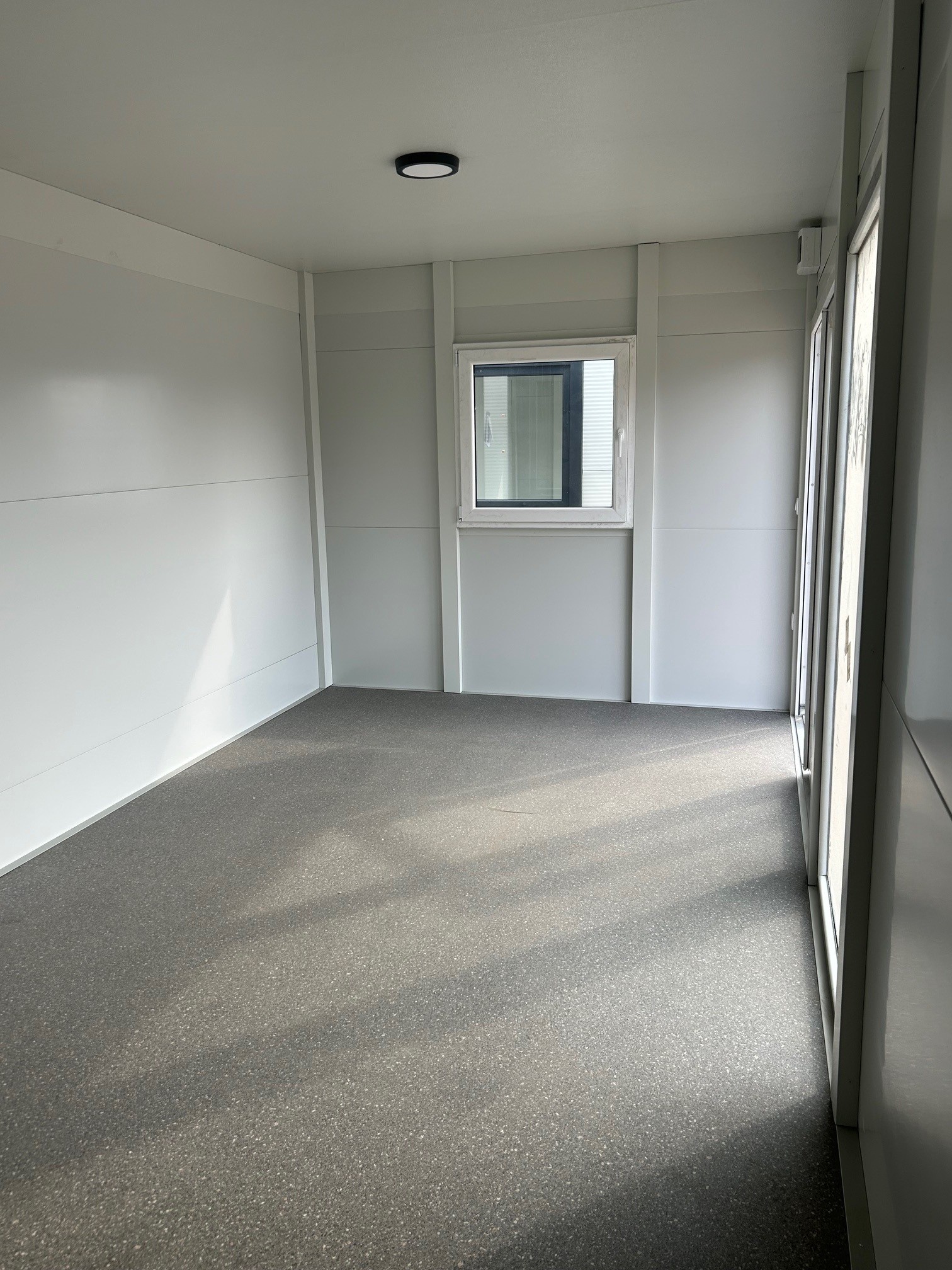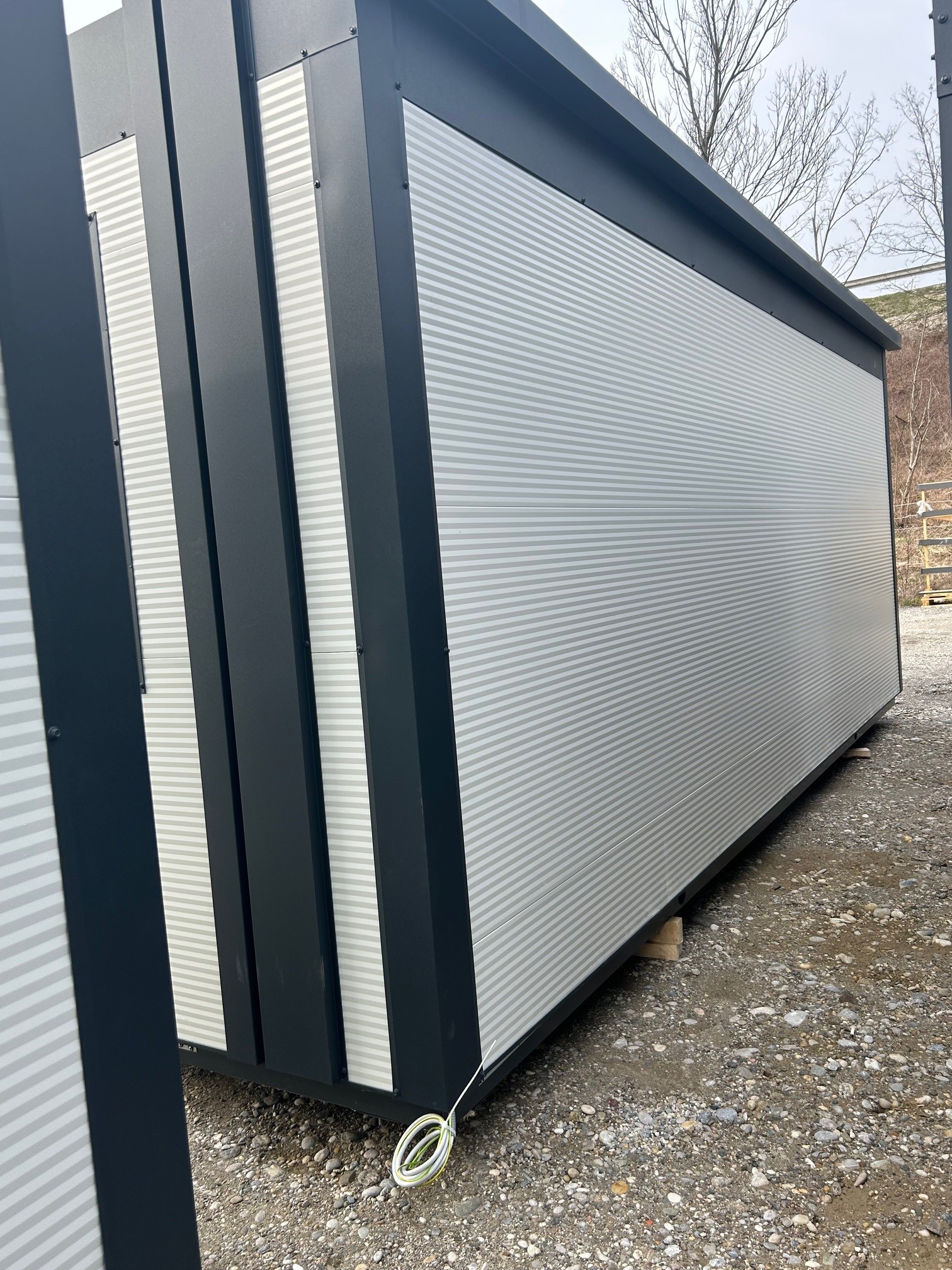 Kontejner dimenzij 6 x 3 x 2,8 m je sodobno zasnovan modularni objekt, ki združuje funkcionalnost, estetiko in kakovostne materiale. Sprednja stran je poudarjena z večjimi steklenimi površinami, ki prostoru zagotavljajo veliko naravne svetlobe ter ustvarjajo občutek odprtosti in povezanosti z okolico. Zunanjost odlikuje atraktivna fasada piano v barvi antracita, ki objektu daje eleganten, moderen in profesionalen videz. Temen odtenek se lepo dopolnjuje z notranjostjo, kjer so nameščeni beli stenski paneli, ki prostoru dodajo svetlino, čistost in občutek prostornosti.