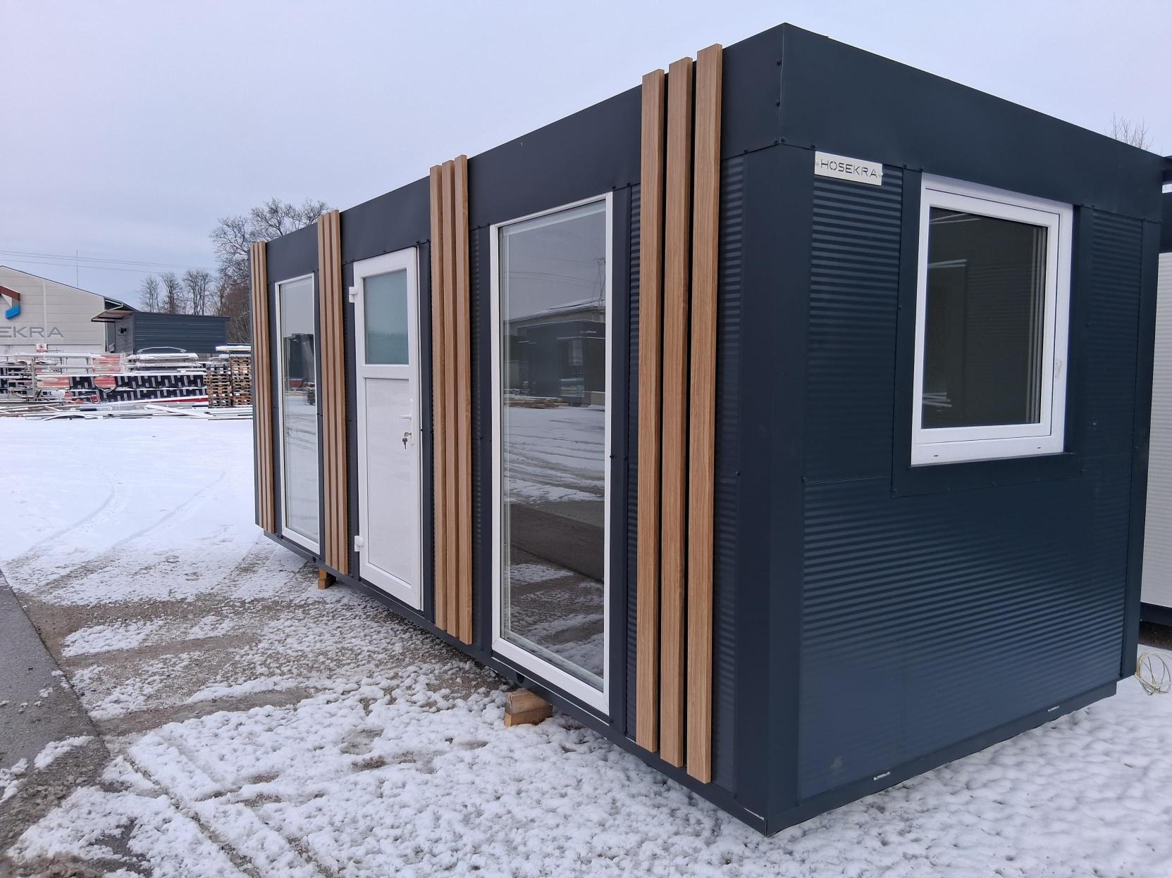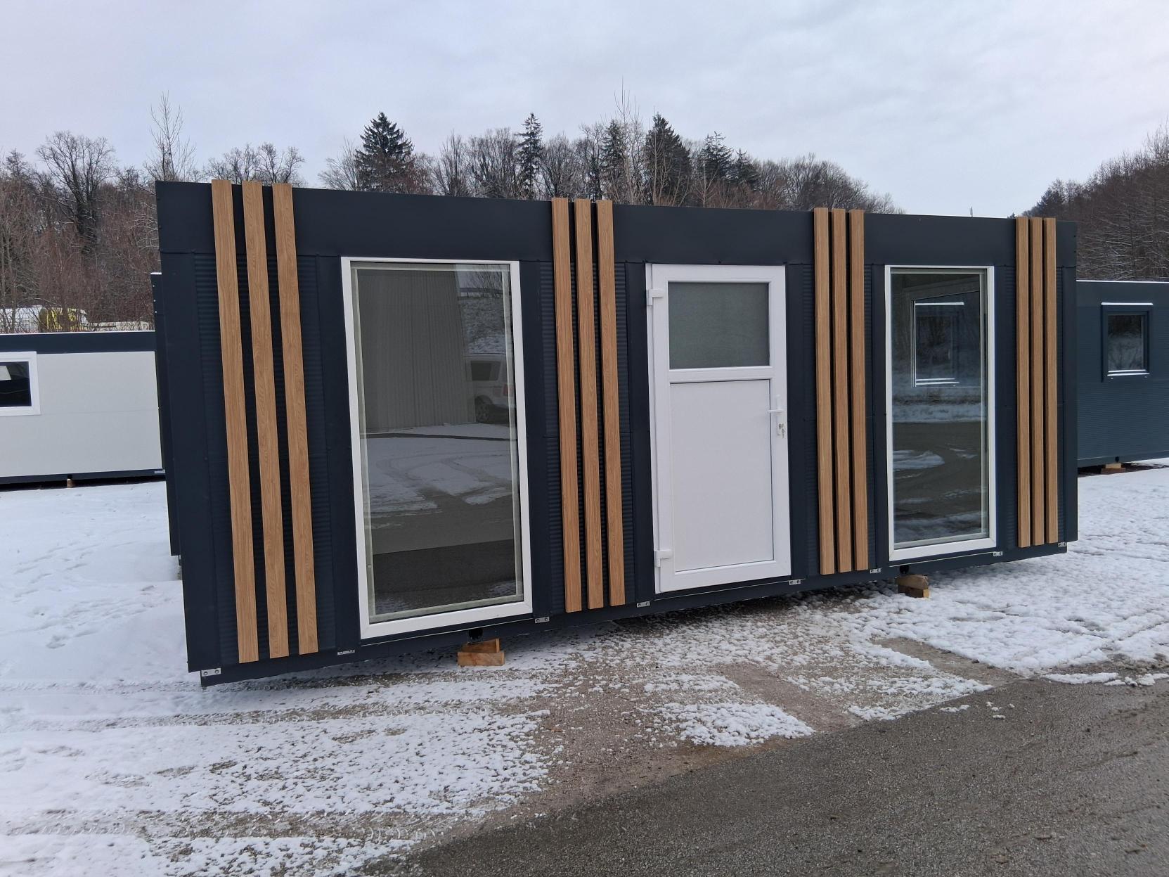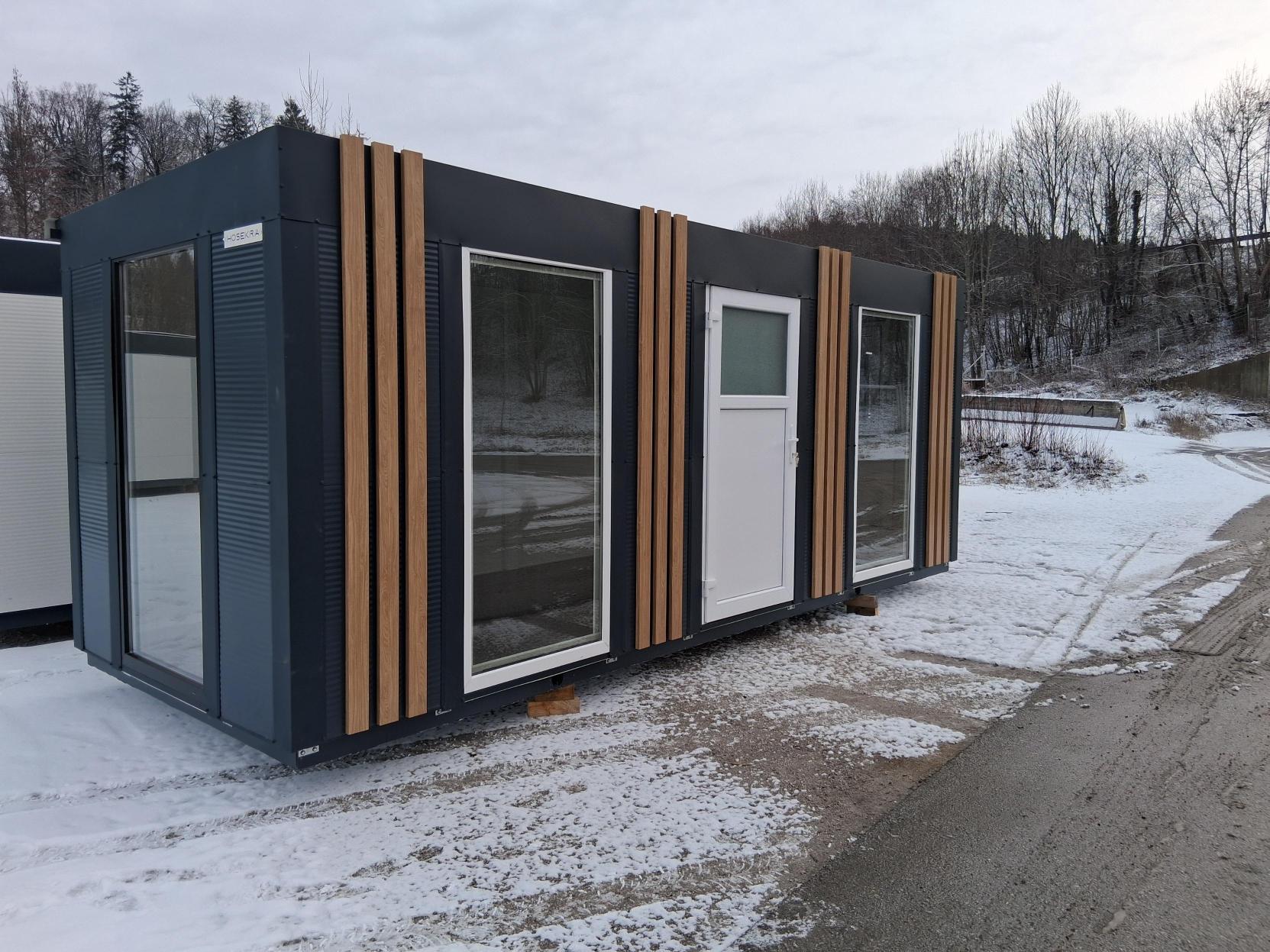 Osnovni kontejner dimenzij 6×2,3 metra, antracit barve s kovisko fasado iz okrasnih letvic v barvi macesen. Dodana so velika okna za dober pogled navzven.