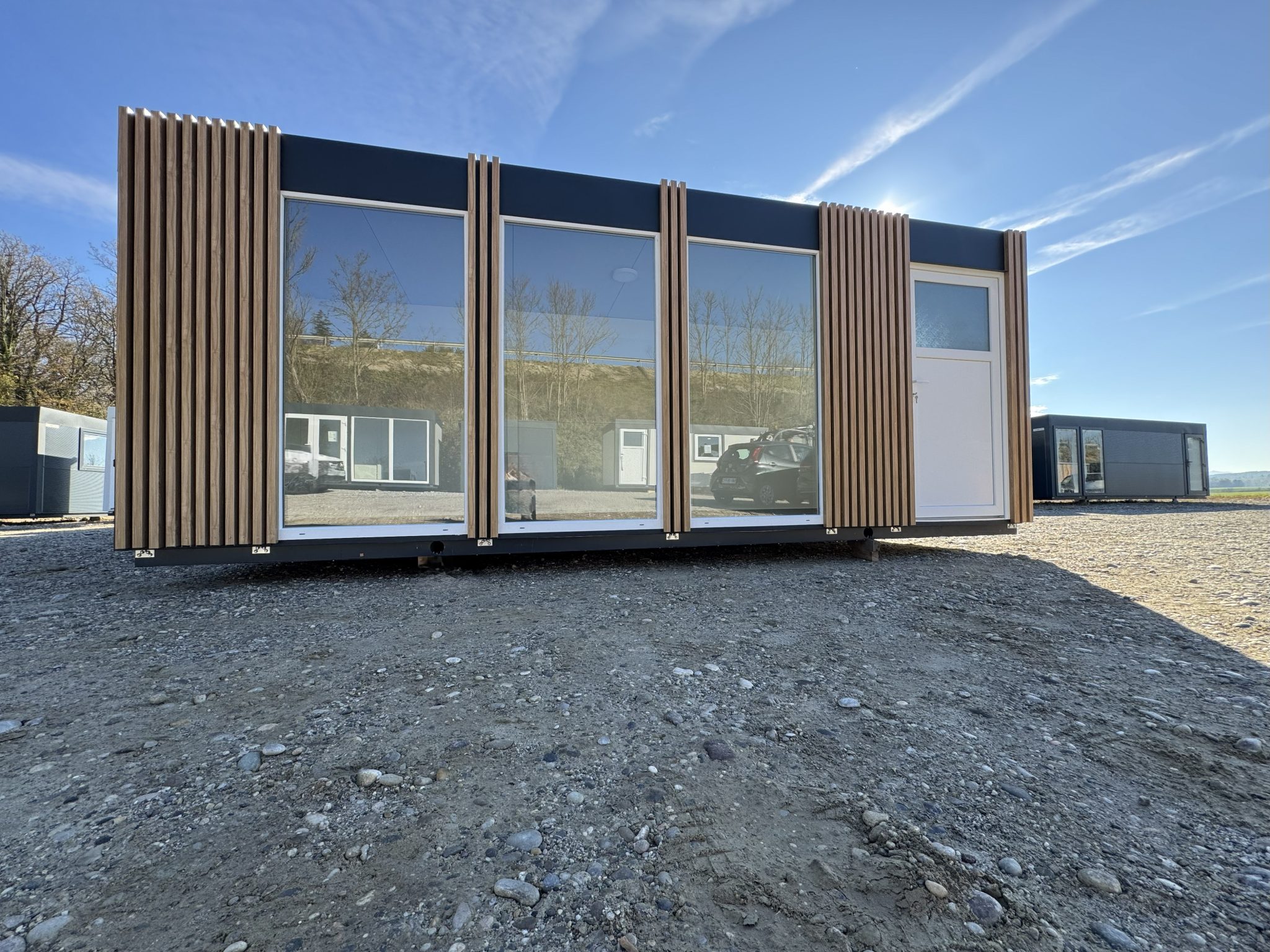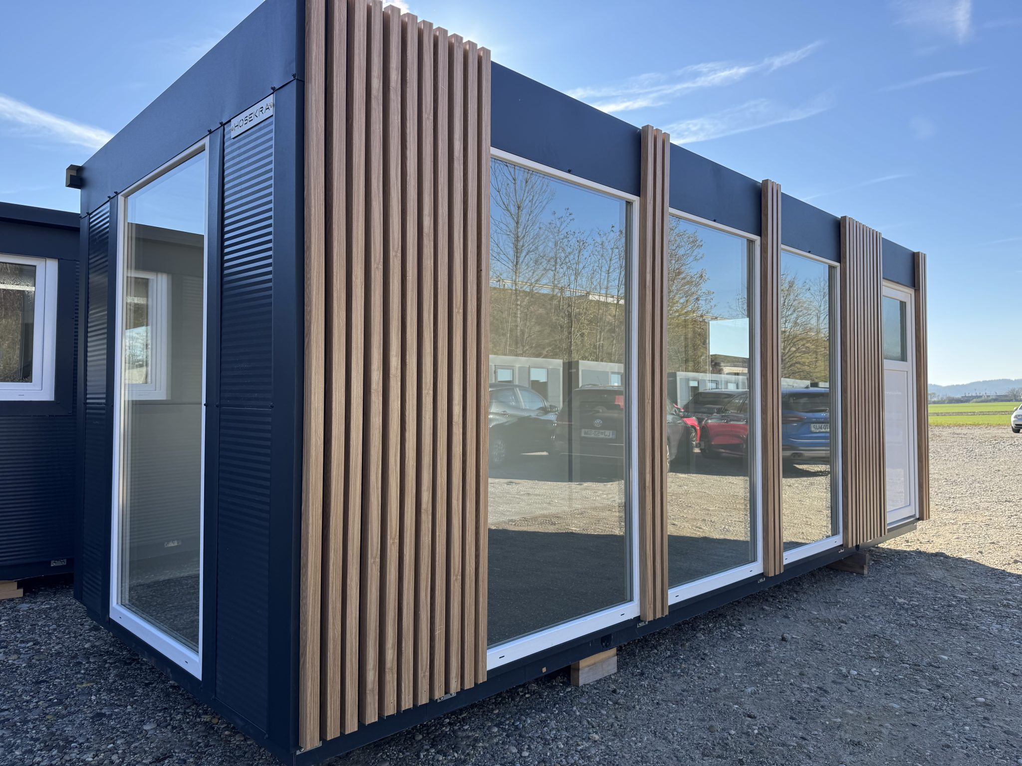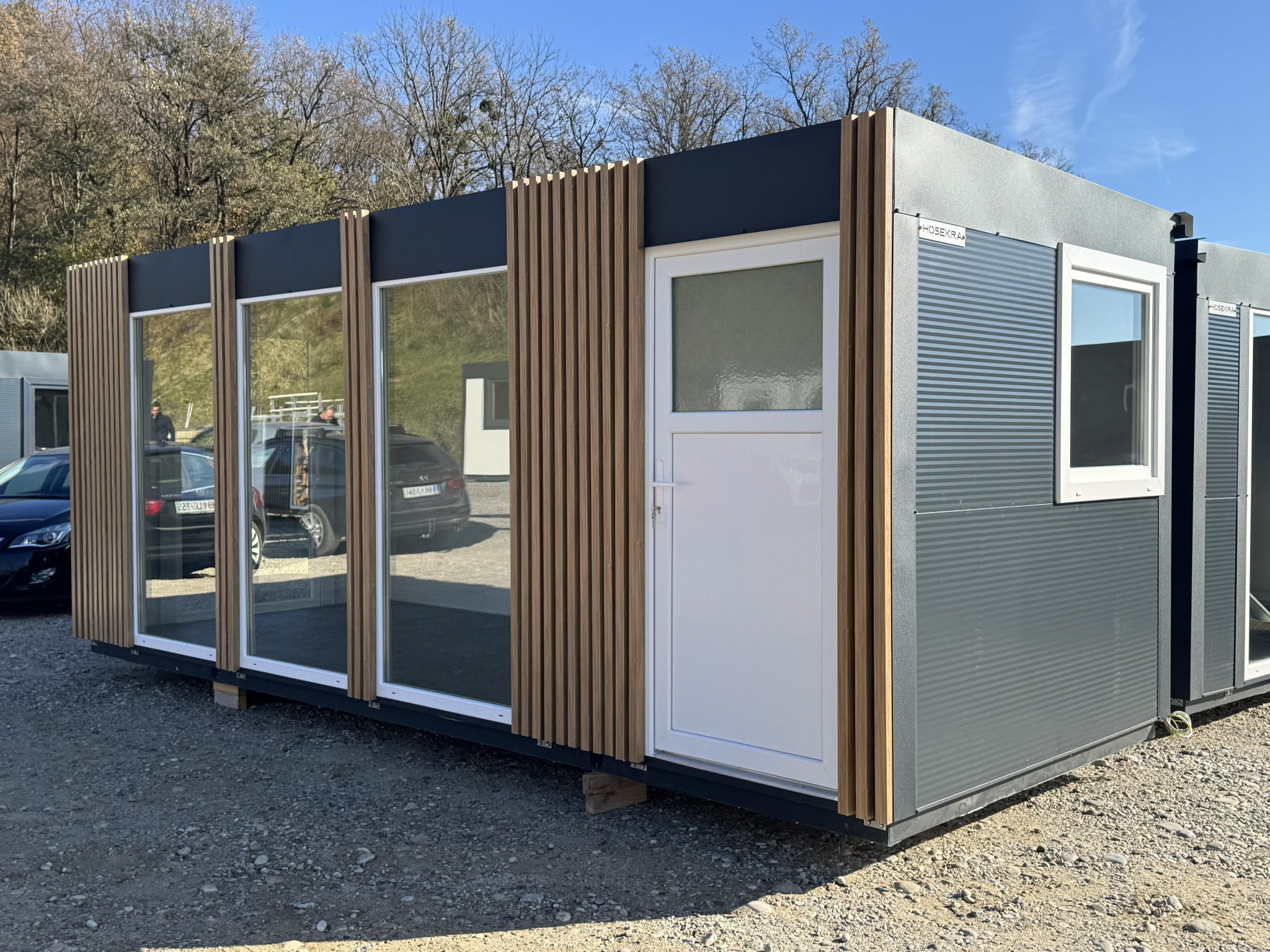 Osnovni kontejner dimenzij 6×2,3 metra, antracit barve z kovisko fasado iz okrasnih letvic v barvi macesen.