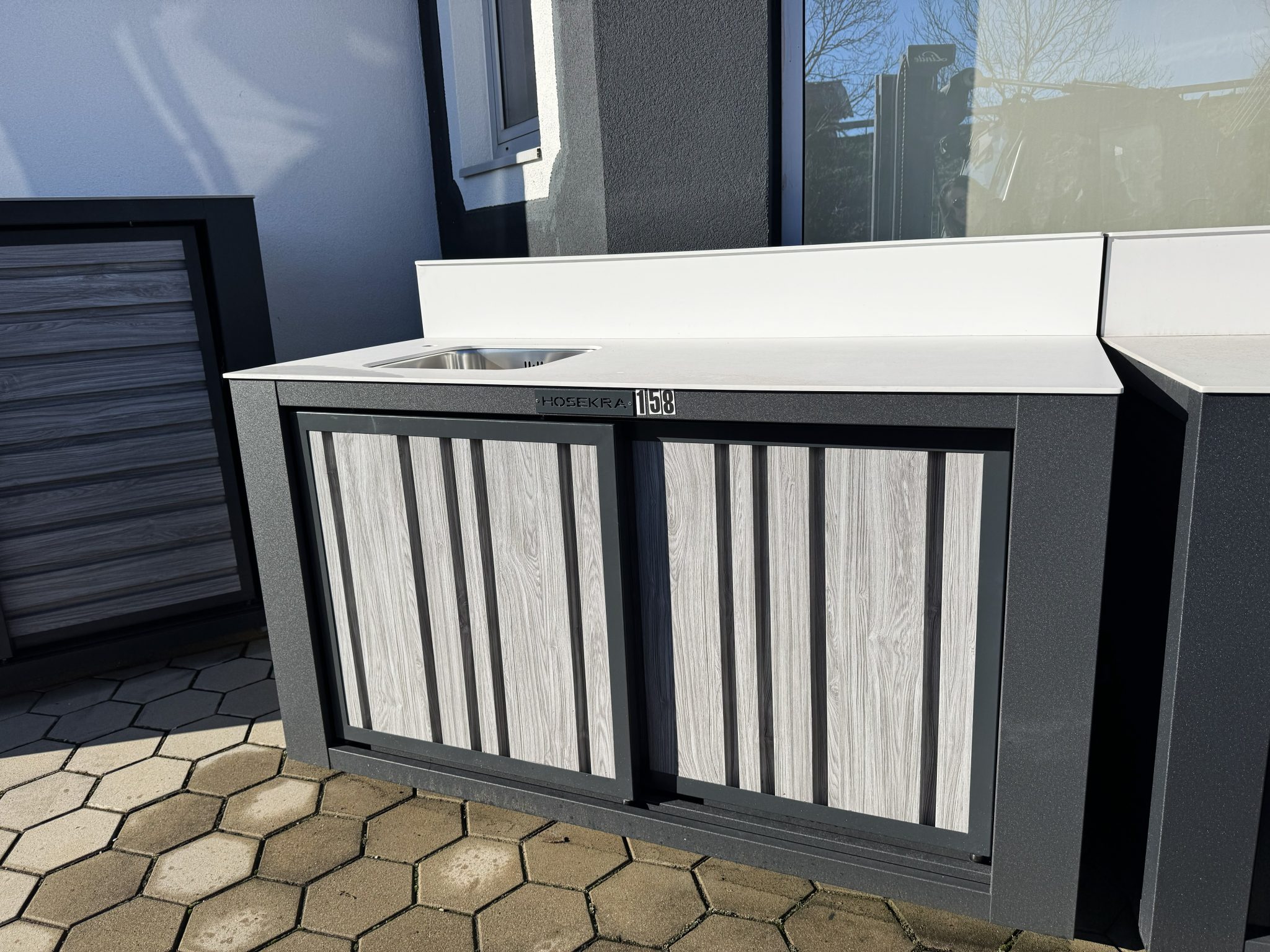 Hosekrina zunanja kuhinja je zasnovana za brezskrbno uporabo na prostem, saj so vsi sestavni deli izjemno trpežni in odporni na vremenske vplive.