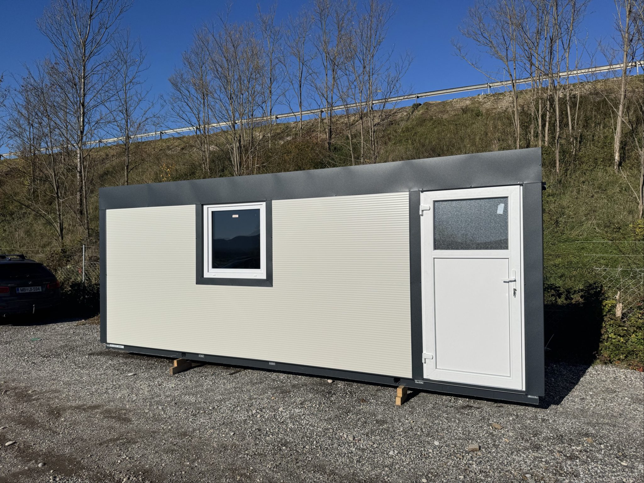 Bele barve, antracit obrobe, 1x okno, 1x vrata, Komplet izoliran, luč + vtičnica.