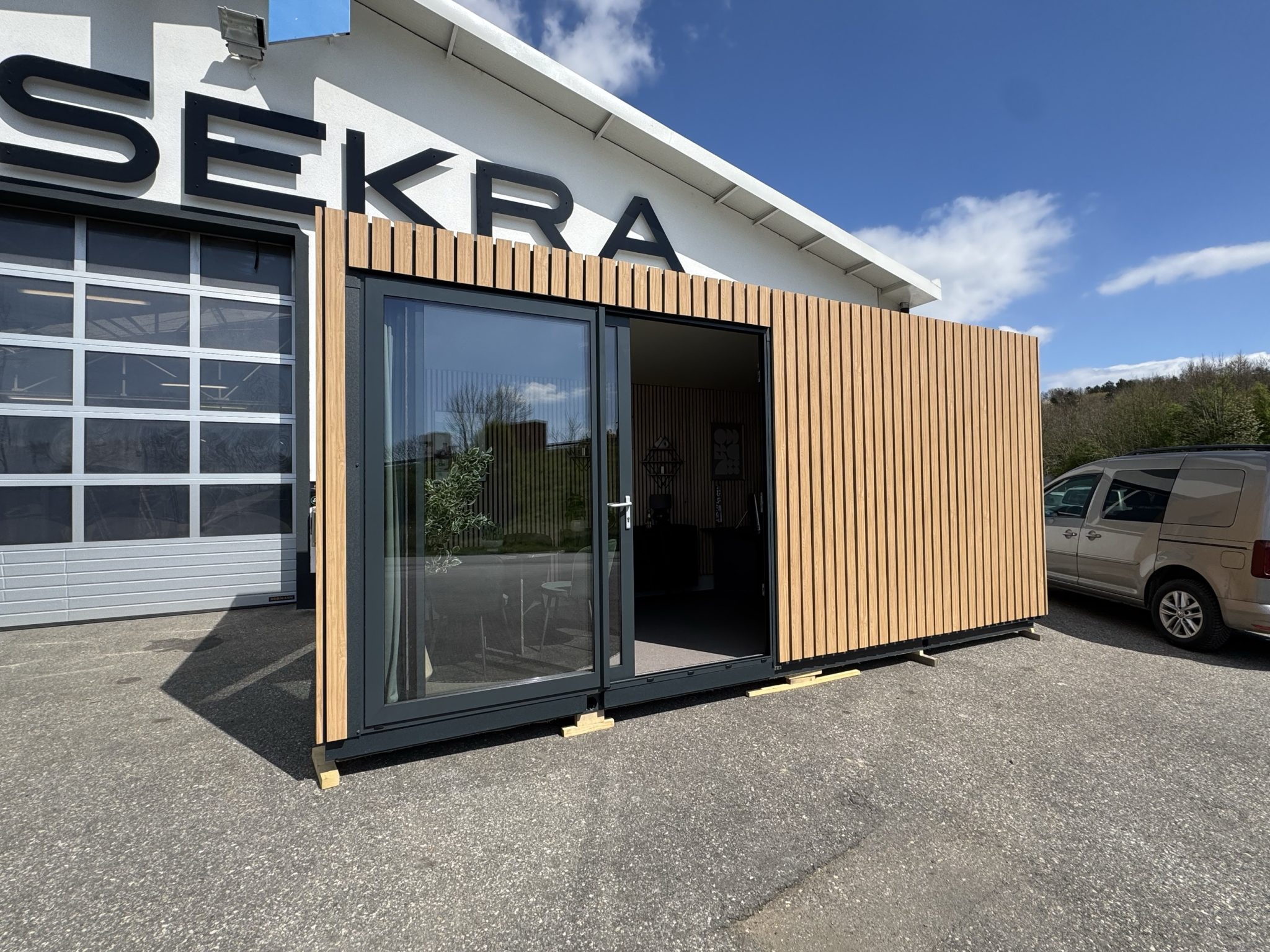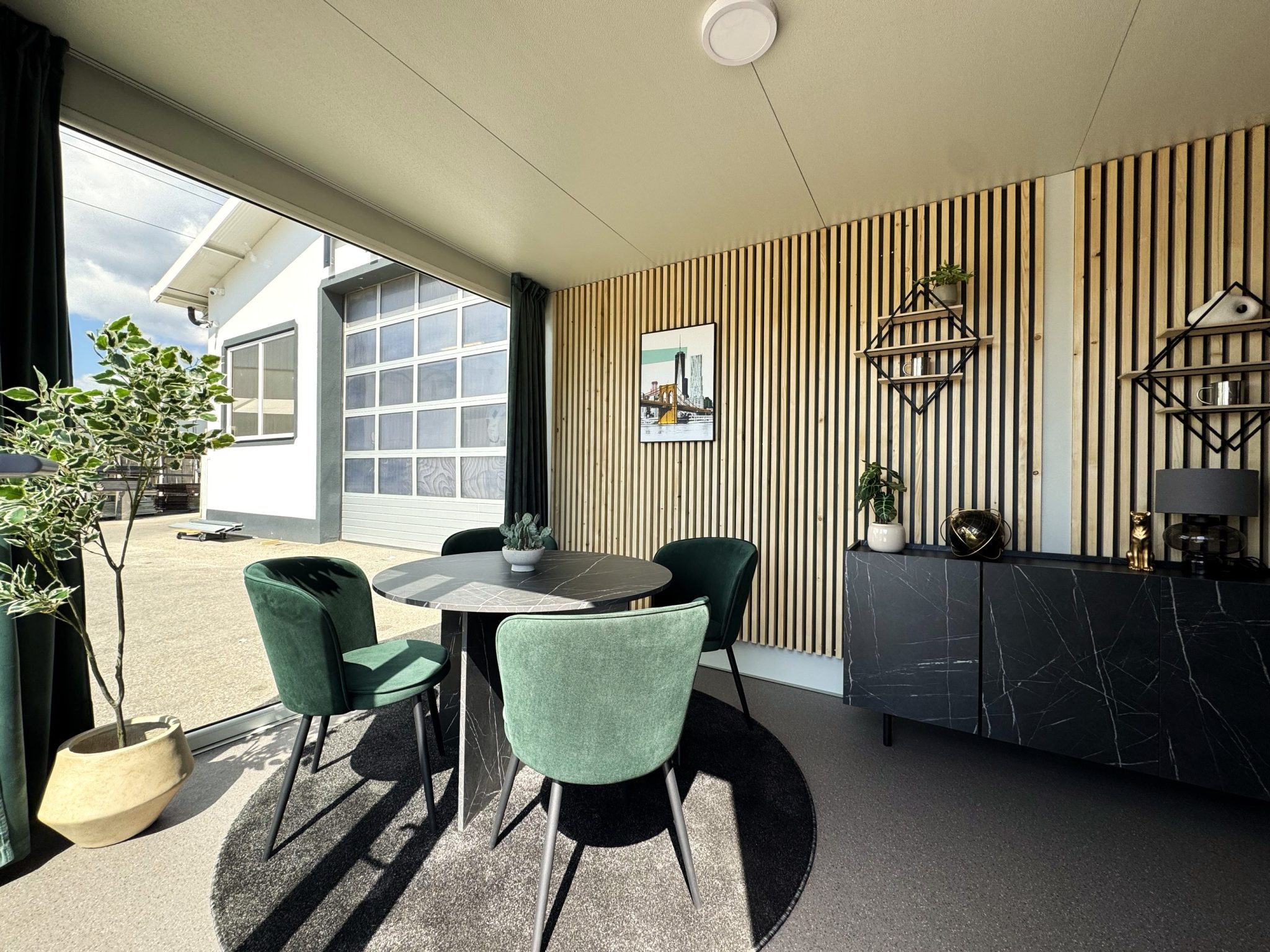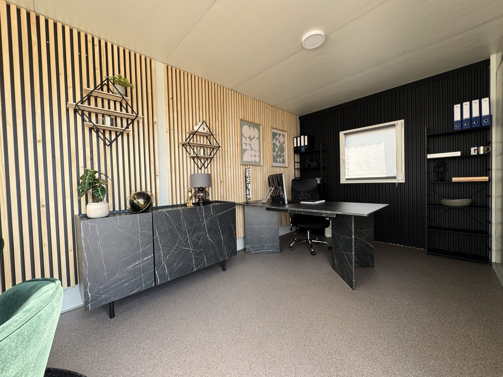 Elegantna zunanjost s kovinsko fasado v imitaciji macesna in panoramska steklena stena ustvarjata moderen in odprt ambient. Notranjost je dovršeno opremljena s skrbno izbranimi kosi, ki združujejo profesionalnost in domačnost. Kombinacija toplega lesa in antracit kovine pa prostoru doda brezčasno prefinjenost. V ceni je celotni opremljen prostor, pripravljen na takojšnjo uporabo.