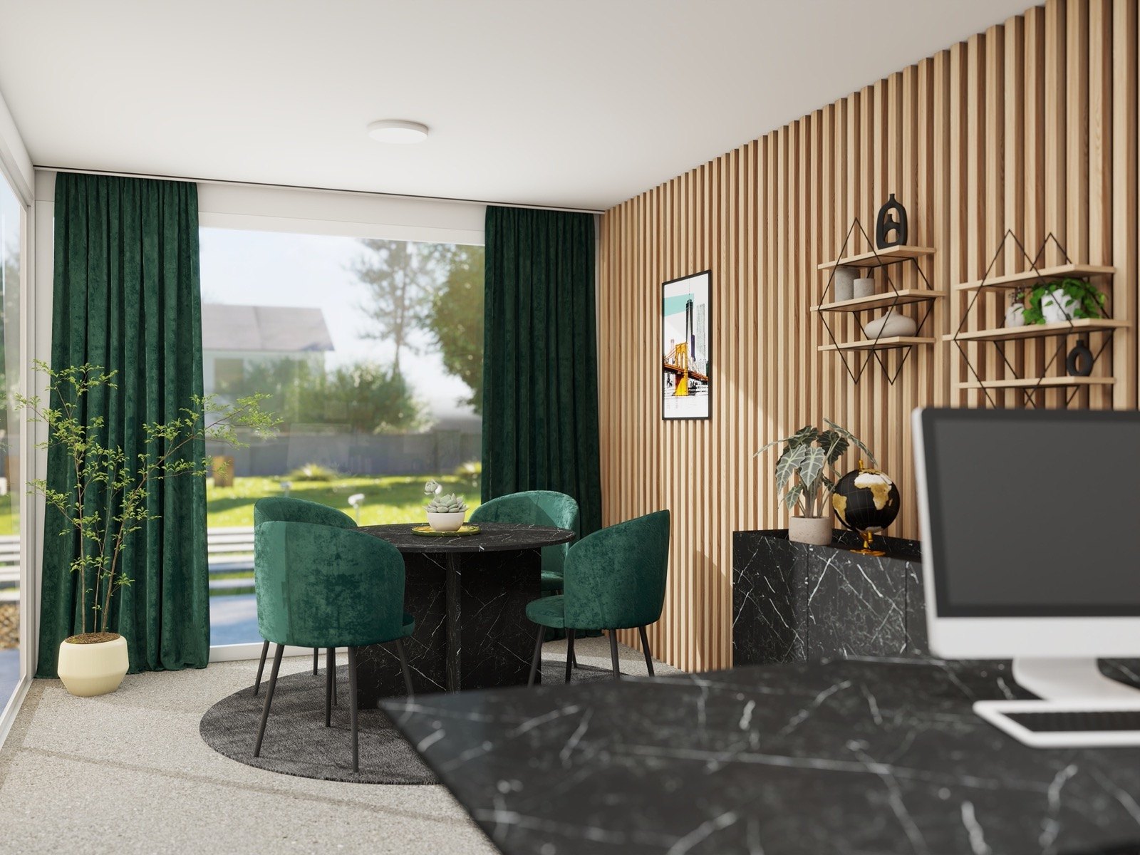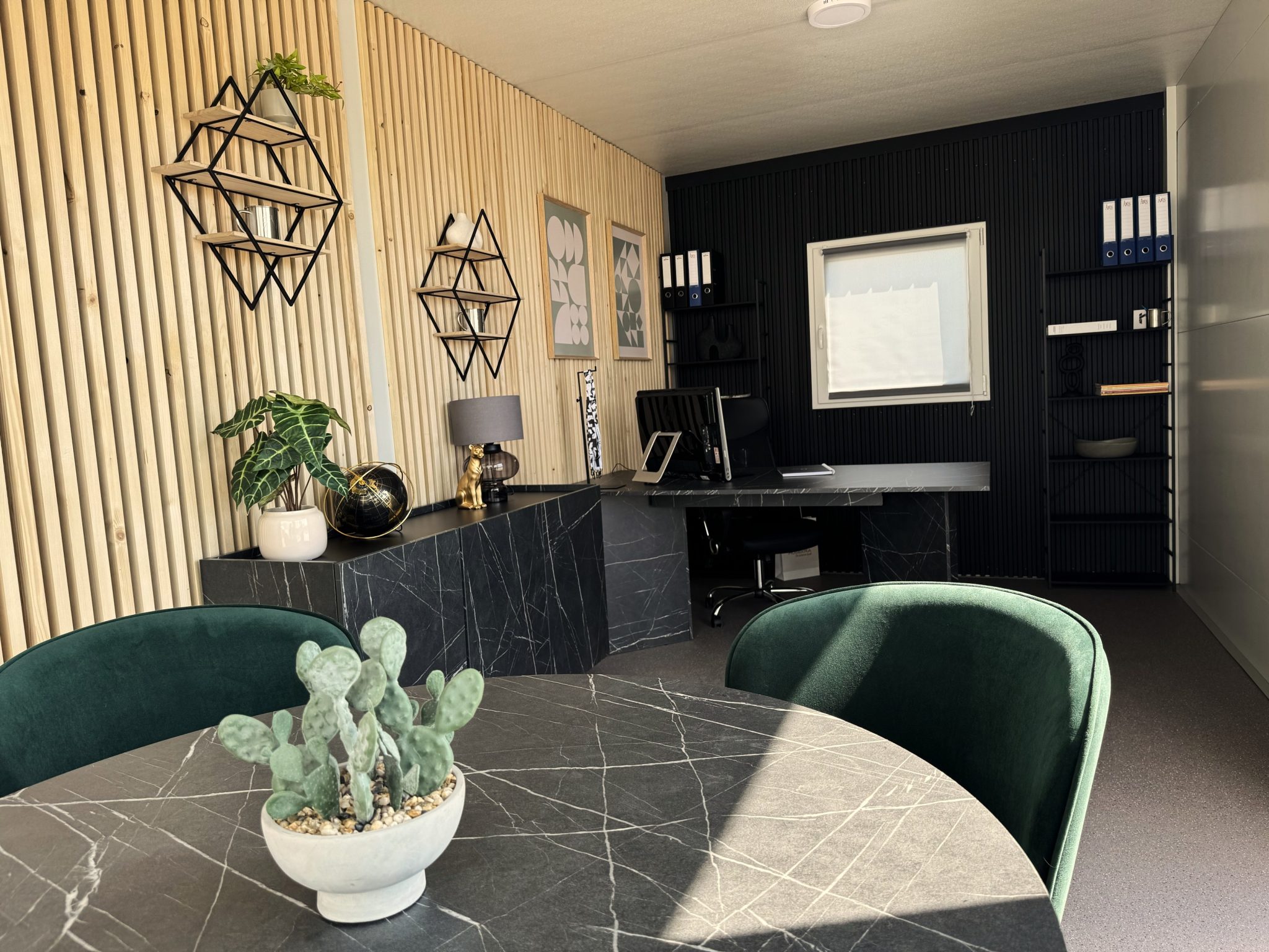 Pisarna MONARCH je prestižna in elegantna delovna rešitev, zasnovana za posameznike, ki cenijo brezčasni dizajn in vrhunsko estetiko. Združuje funkcionalnost s kakovostnimi materiali, kot so črni marmor, tople lesene obloge in umetniški dodatki, kar ustvarja okolje za produktivno in samozavestno delo.