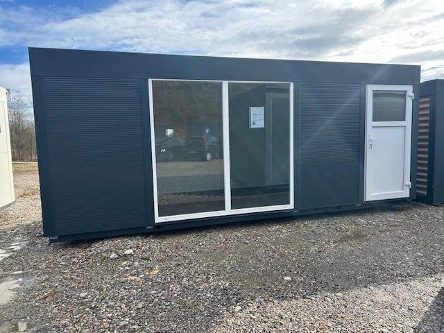 Predstavljamo vam sodoben pisarniški kontejner dimenzij 6 x 2,3 x 2,3 m, ki združuje funkcionalnost, eleganco in hitro postavitev. Zunanjost v prefinjeni antracit barvi v kombinaciji z velikimi steklenimi površinami ustvarja profesionalen in sodoben videz, ki se odlično poda tako v urbano kot industrijsko okolje.
