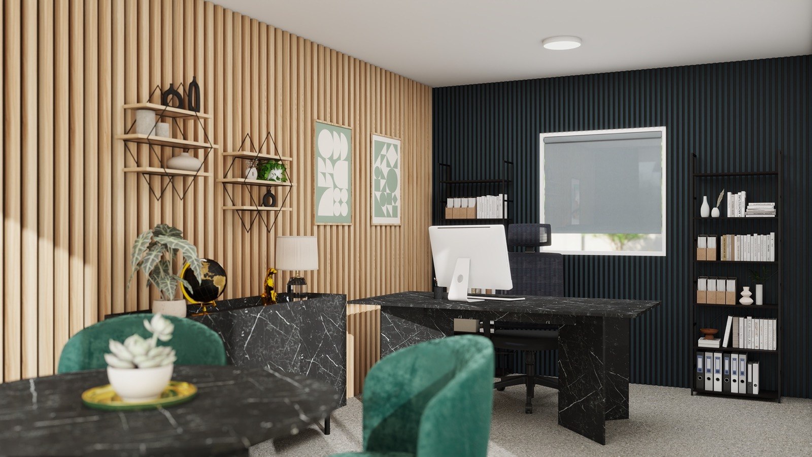 Kontejner Pisarna 6×2,3x3m je popolnoma opremljen kontejner, pripravljen za takojšnjo uporabo kot pisarna. Zasnovan je z modernimi kovinskimi letvicami v barvi naravnega macesna, ki mu daje eleganten videz. Notranjost vključuje pisarniško opremo in stilizirane dekorativne elemnte za zaključen videz celote pisarne.