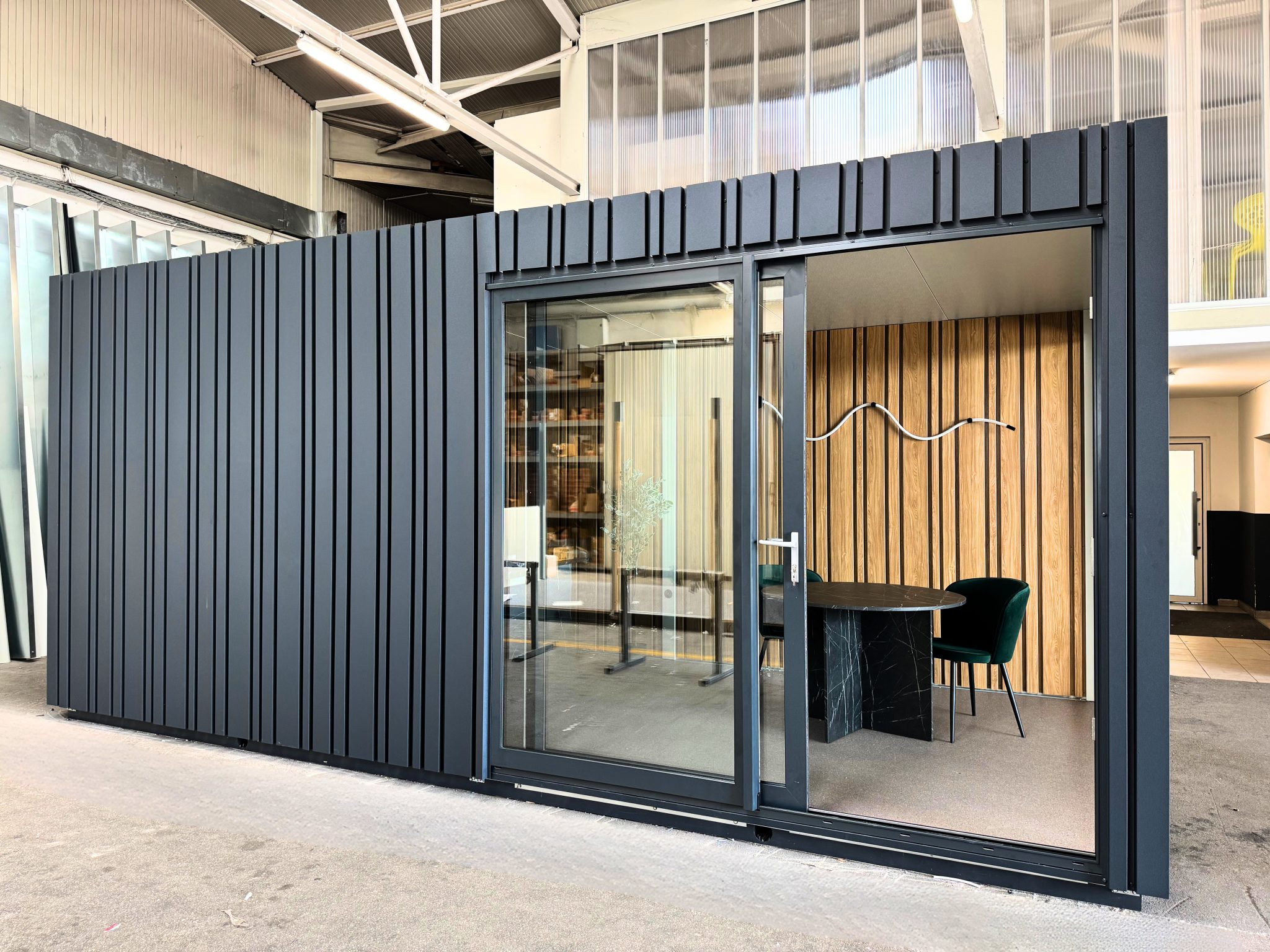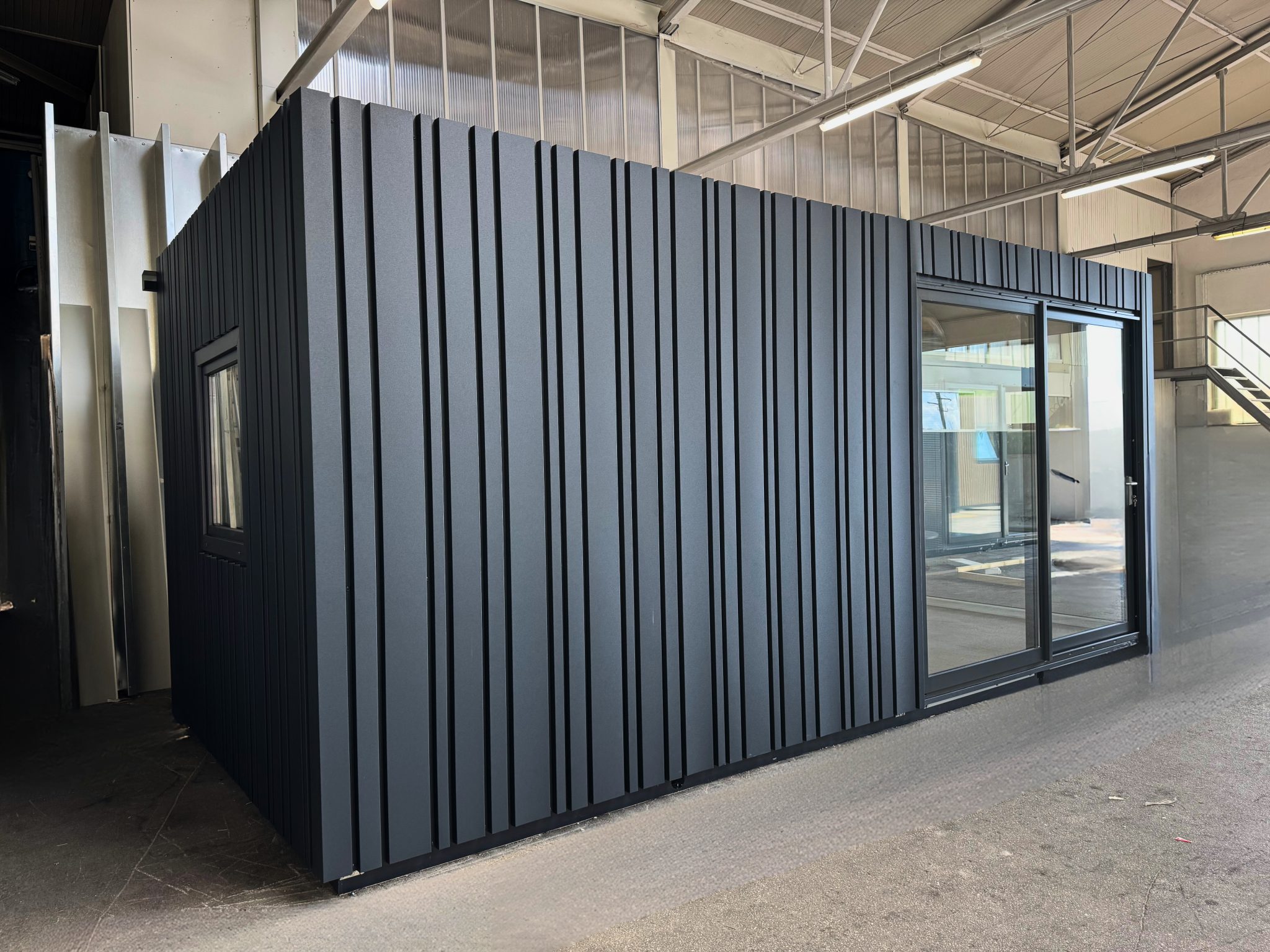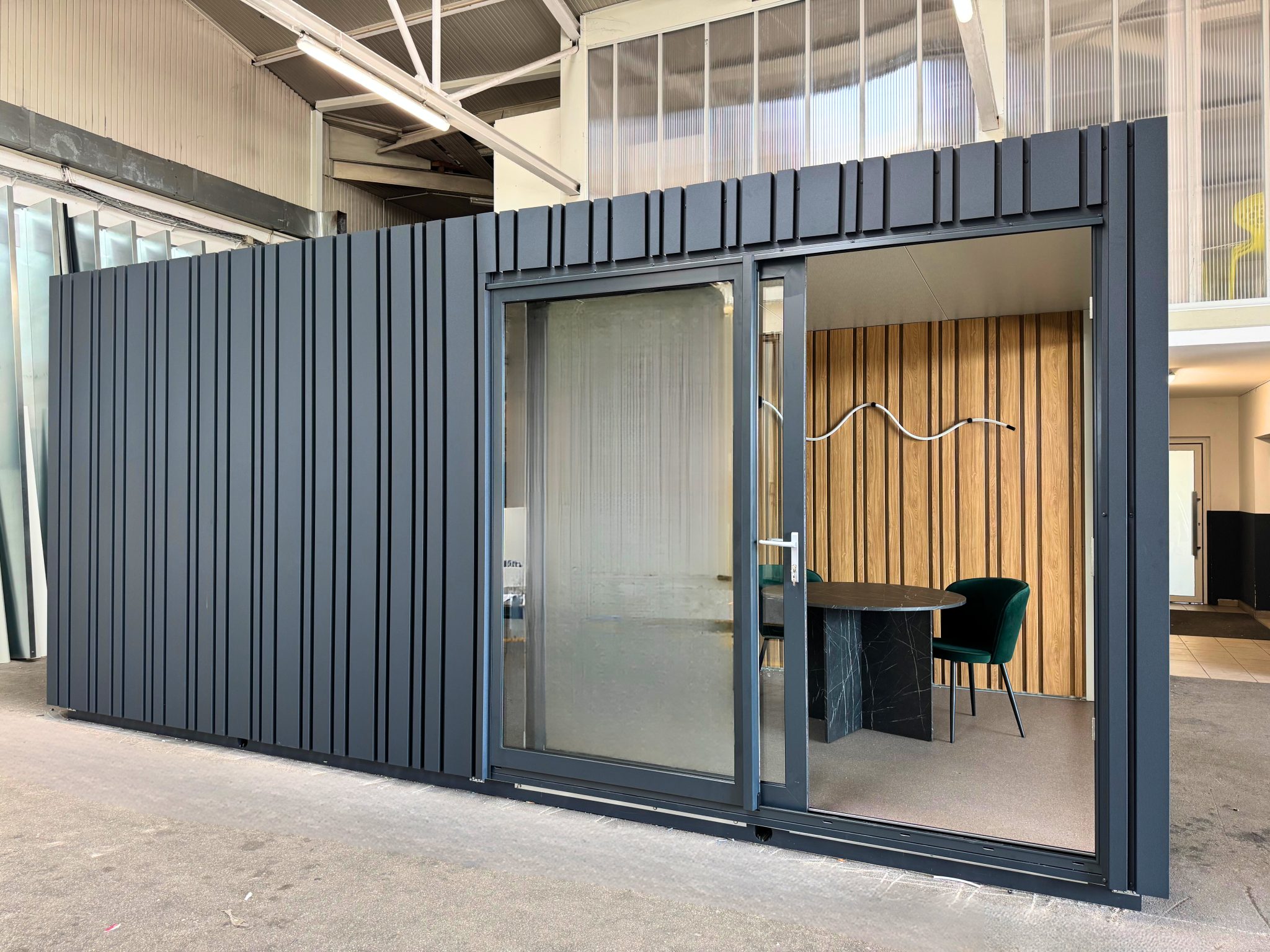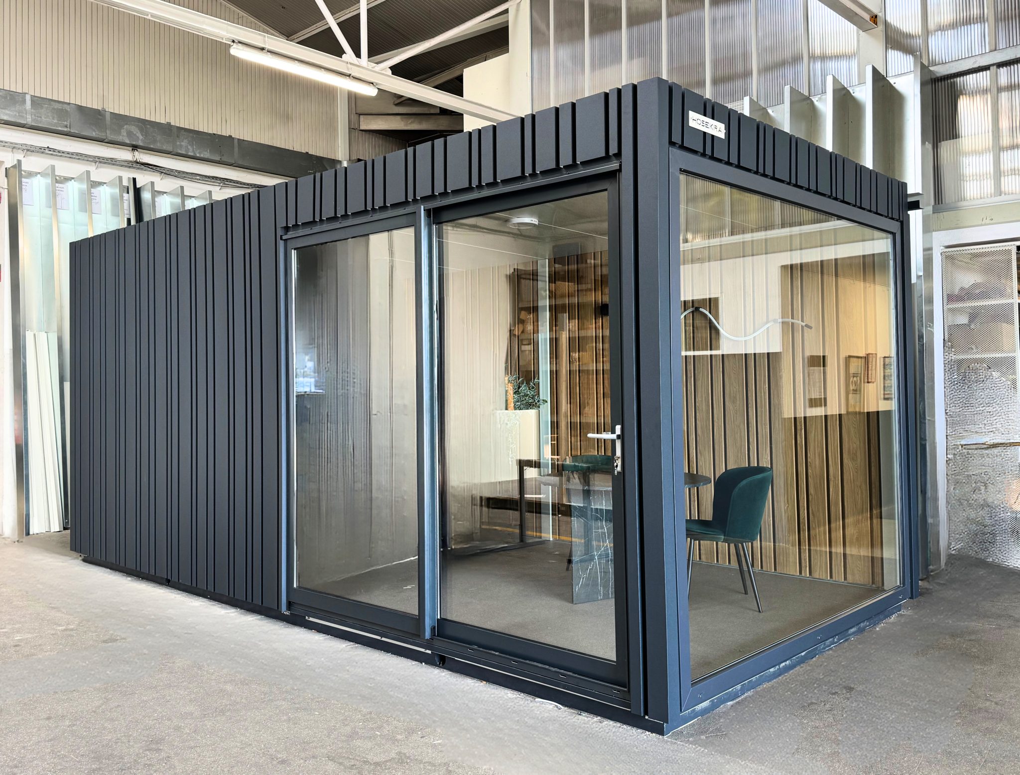 Komplet izoliran, panoramsko okno, drsna vrata, lučmi in vtičnice. Ima številne možnosti uporabe, od pisarn do različnih poslovnih prostorov.